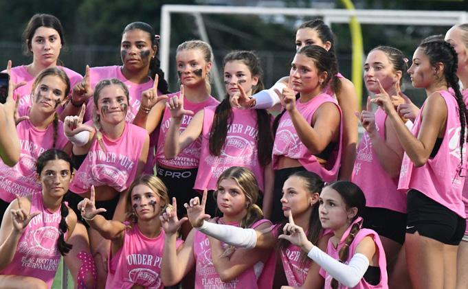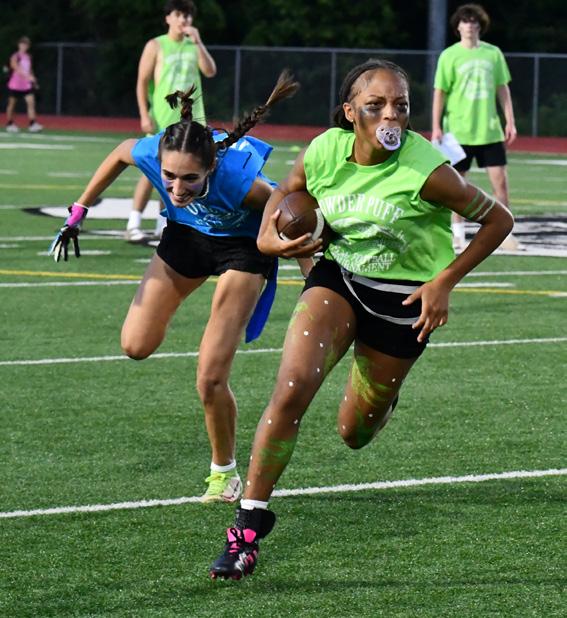 toilet Senior Brynn Baldon grabs the jersey of freshman Maddie Moffitt in the championship game on May 10. The freshman won 14-6. Photo by Grace Darcy. As time expires on the clock, the seniors sprint onto the field to celebrate their 14-6 victory over the freshmen in the championship game. The Class of 2024 also won the Powder Puff tournament last year. Photo by Maya Ortiz. Senior Sienna Morales pulls down an interception in the championship game. She and teammate Reese Shaw helped lift the seniors to the win. Photo by Maya Ortiz. Senior Lexi Villanueva tries to stay on her feet after she pulls the flag from freshman Rionna Martin in the championship game on May 10. Photo by Maya Ortiz. The sophomores take a picture after finishing in fourth. They are 0-4 in two years of Powder Puff games. Photo by Grace Darcy. Senior Uzziel Ruiz Ortiz strikes a pose after being launched in the air by his fellow cheerleaders during the Powder Puff game on May 10. Photo by Maya Ortiz.Summer Vacation. Almost there. Graduation.