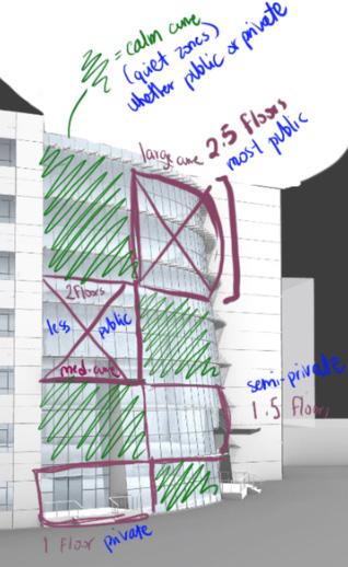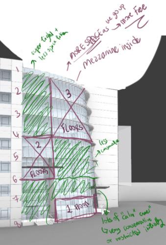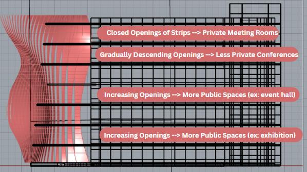 Gradually Descending Openings --> Less Private Conferences Increasing Openings --> More Public Spaces (ex: event hall) Increasing Openings --> More Public Spaces (ex: exhibition)