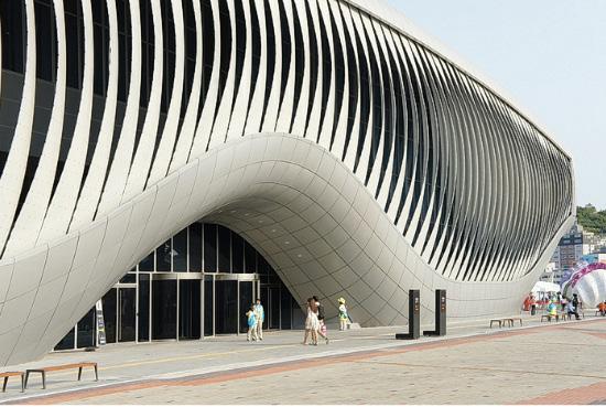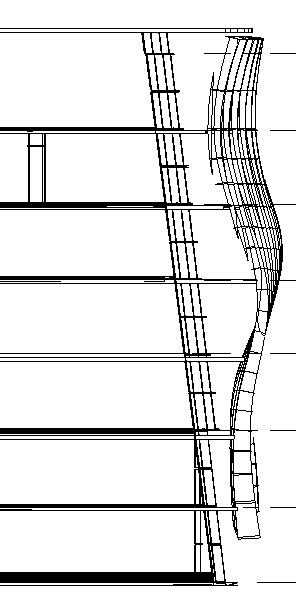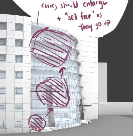 The curtain walls are not touching the roof (slab above) and the rectilinear language isn’t fitting with the curvilinear facade.