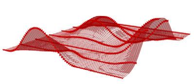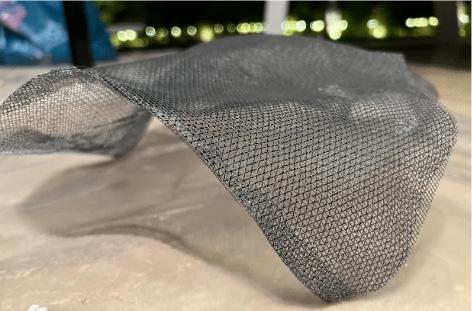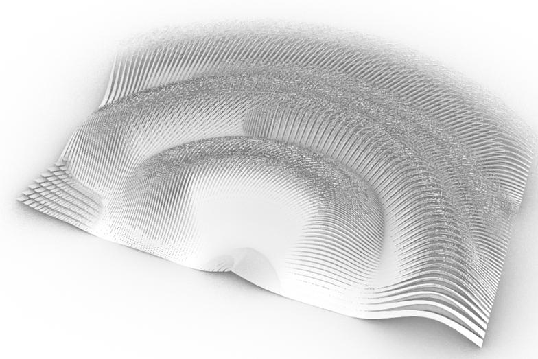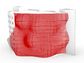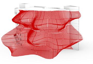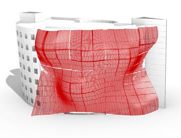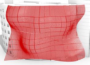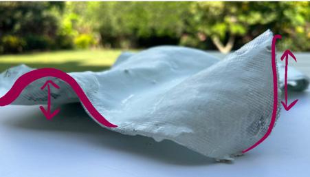 Creating thin concrete panels: substructure of flexible wire mesh & a lining made of latex sheet determining panel’s final form.