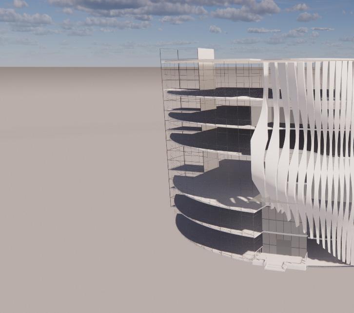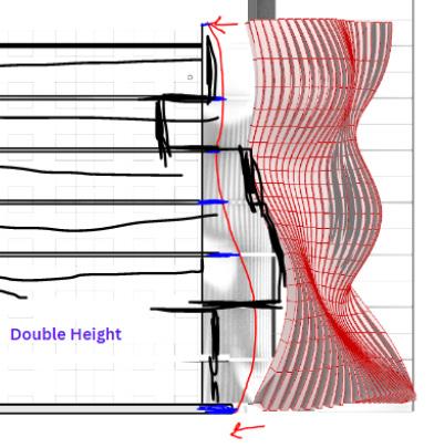 I creates openings for the entrances and started using importing the facade from Rhino as a mass to Revit, drew the outline of the facade in interior to either fit exactly the slab like a puzzle completing one another & have the facade be served as a wall, or have a curtain wall that’s offsetted from the facade, allowing for space to create terraces wherever suitable.