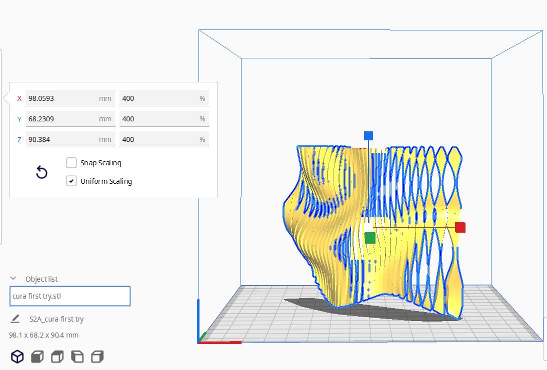 I started the fabrication process by exporting the facade from Rhino as an “.stl” file and importing it in Ultimaker Cura. The facade was automatically imported in millimeters. as default (Fig. 1), even though the units in Rhino is in meters. When I sliced it, the process was listed as 9 minutes as the duration for the facade to 3D print, which was what made me realize that there is an issue with the size. Therefore, I enlarged the scale of the facade to 400% (Fig. 2) to create a reasonable, logical size for the final real life product (Fig. 3). The adjusted total time process was then 5 hours and 10 minutes. With that reason, I started rotating the facade to investigate how it can affect the time process.