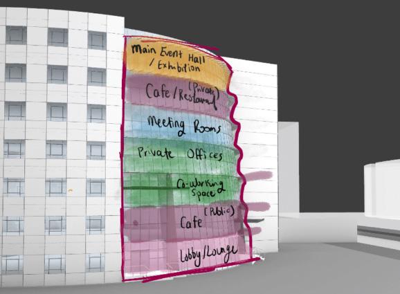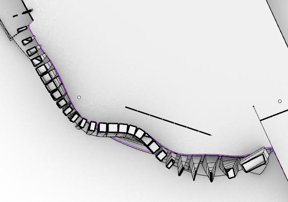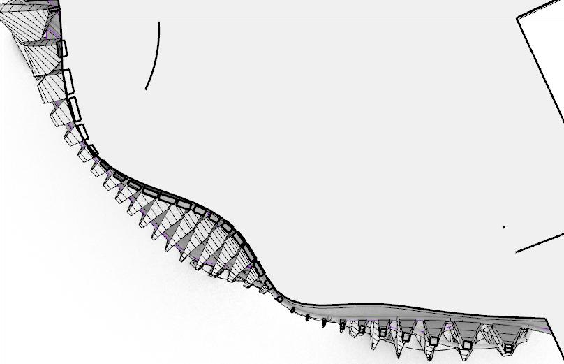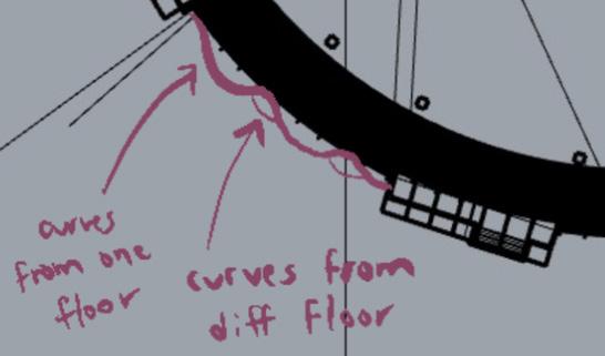 I started importing my facade from Rhino to Revit as a mass so that I can start creating my slabs directly from Revit then exporting it back to Rhino as I was more flexible with this since I can easily select the outline of the facade where it touches the slab to help me in creating the exterior of the slab. However, I was still confused on how to make the plans look more diverse and have more variety. The west section included more annotations than the south section as I had already spent too much time working on one section (it was hard to extract ideas and connections at this phase).