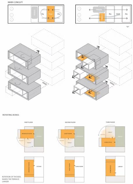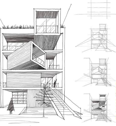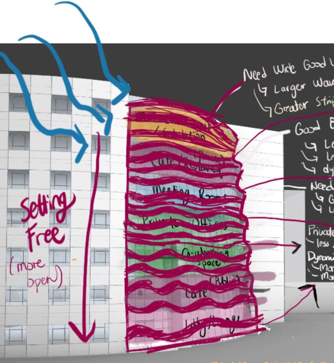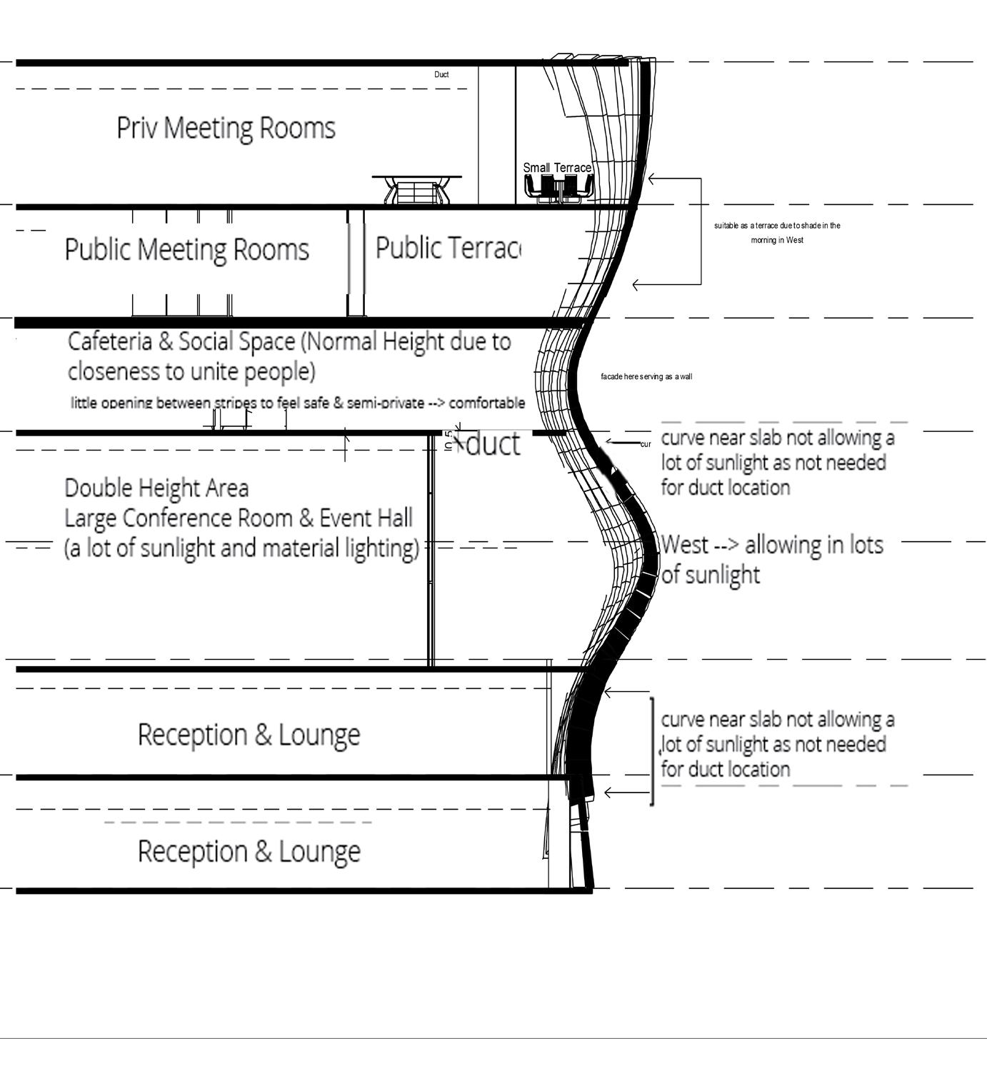 Level 1 0.0 Level 2 3.1 Level 5 12.3 Level 6 15.4 Level 7 18.4 Level 8 21.5 Duct Duct curve near slab not allowing a lot of sunlight as not needed for duct location curve near slab not allowing a lot of sunlight as not needed for duct location 0.5 West > allowing in lots of sunlight suitable as a terrace due to shade in the morning in West Large Terrace Small Terrace Private Meeting Rooms Public Meeting Rooms facade here serving as a wall Cafeteria & Social Space (Normal Height due to closeness to unite people) little opening between stripes to feel safe & semi-private > comfortable Reception & Lounge Reception & Lounge Section Learning from Materiality