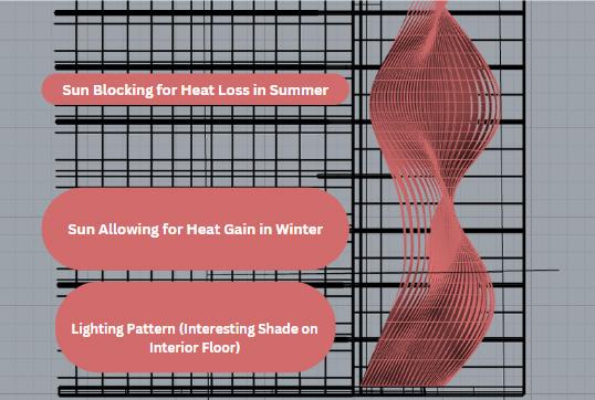I really loved and enjoyed this course to be honest and it helped me create my main structure in my Vertical A project. I’ve even used the same similar structure that represents a “rib” kind of structure in the previous code shown above like the one I used also in my Vertical A project so I cam up with that code on my own based on my experience already which was surprising to me personally as I would always feel the need to ask a TA for help in Grasshopper. Although I feel like I’ve done relatively good progress in Project 1, I could have done way better in Project 2, yet I spent stuck in a long time trying to figure out whether my facade should be static or responsive (which turned out to be static). I could have also spent more time explaining which parts of the facade respect to which environmental parameter like the temperature and wind which is there but didn’t deeply explain it. The wide openings let in indirect sunlight and cool wind while the closed openings block high heat. Overall, I really loved this course and I’m super grateful I had this opportunity to take it.