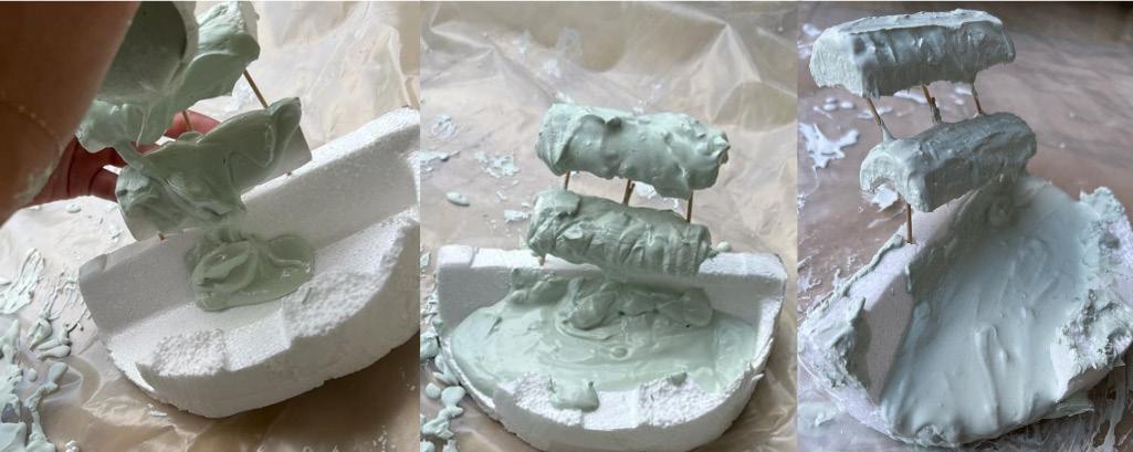 I did three trials in this stage, experimenting with a strong objective at the start of creating a cable network before pouring the gypsum & water as a support, then diverting into a casting technique with no rigid idea in mind, and finally reverting back to fabric formwork techniques with soaking fabrics instead to create my final form.