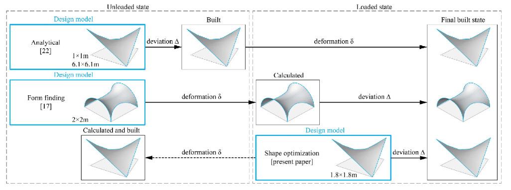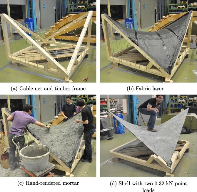Fig. 1 Design process for prototype concrete shells using a hybrid cable-net and fabric formwork