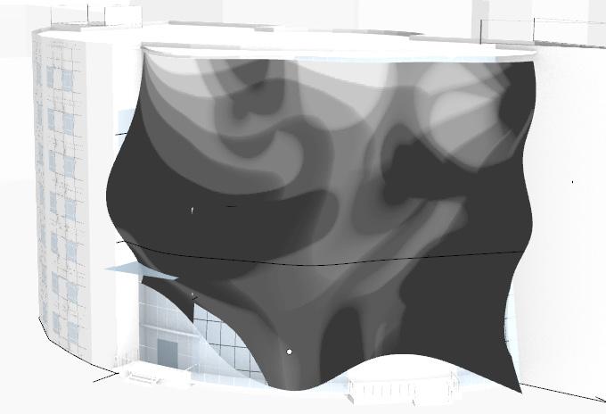 Using grasshopper, the number of hours of direct sunlight received by the facade using sun vectors from the sunPath component was studied. Black represents least amount of direct sunlight and white represents the most.