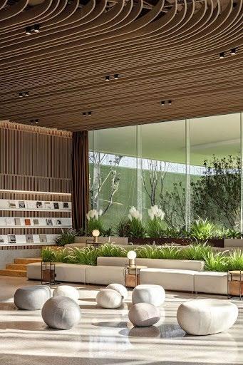 Curved wooden walkway in the form of bands creates a sense of openness upon the entrance