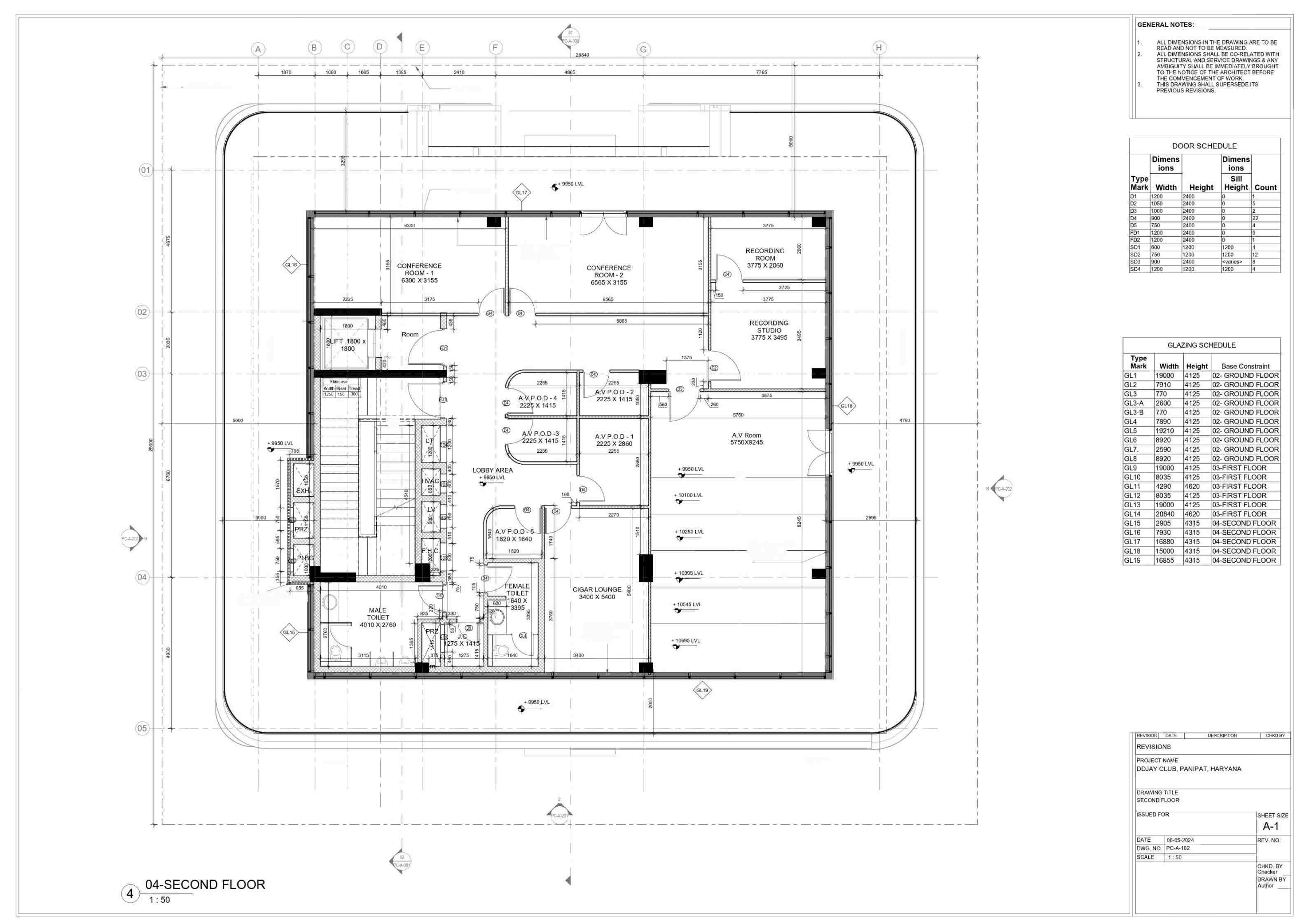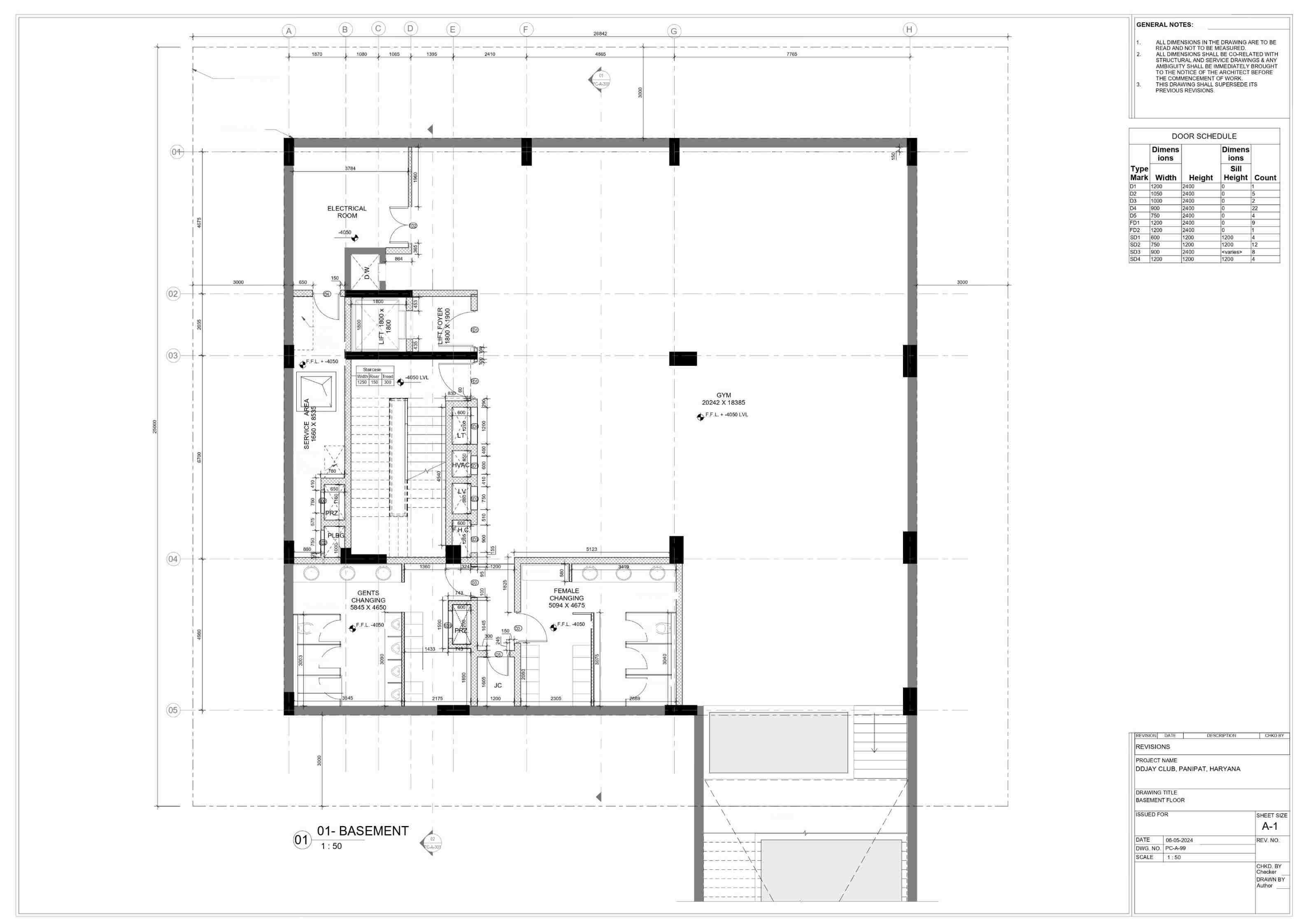 This 952 sq.m. club features a minimalist design, promoting harmony and refreshment. The three-story building (Basement, G+2) boasts a strategically placed staircase on the left side, accompanied by a lift and shafts.