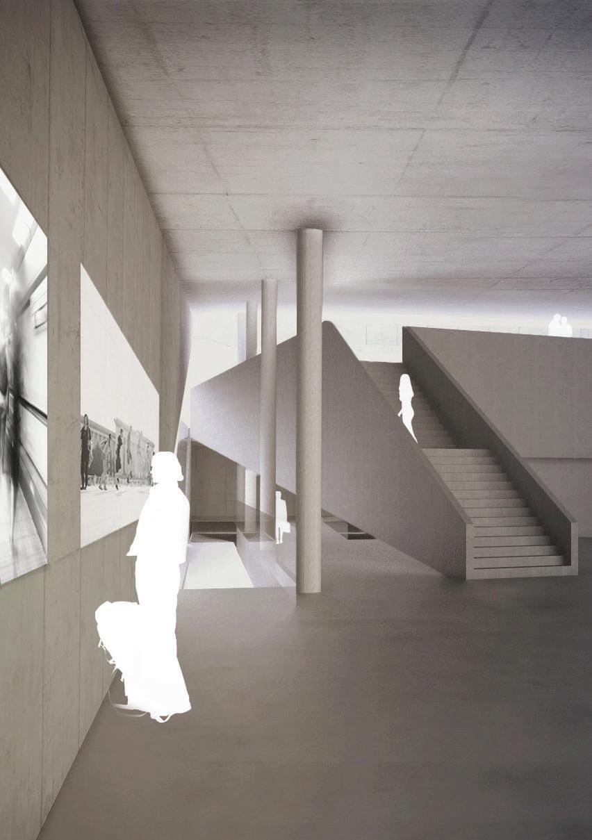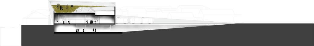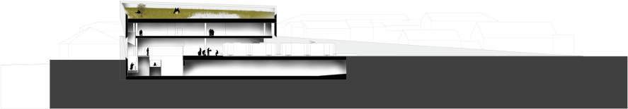The part of the square, which is undermined, rises smoothly to a slope, the square remains sills obtained as its continuation, leaving only a few locations guessing the underlying building. The cresting level o ers to its visitors the unique opportunity of full overview of the city. The KunsTerminal, at its southeast corner, is presented di erently, because it fits with its urban cubature into the urban structure. The topic of “merging“ is the main design idea: From inside to outside, from the square to the roof, floor tiling to green spaces. All elements are trying to find a possible resolution to continue. The concept of the “ KunsTerminal “ refers to the variety of uses of the created surfaces and spaces that were developed in the project.