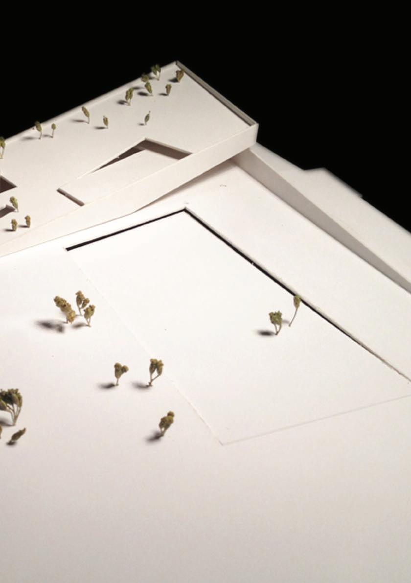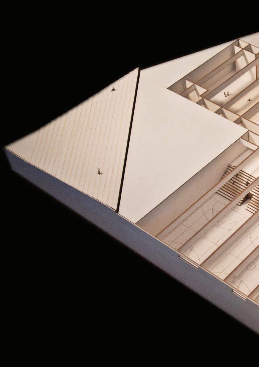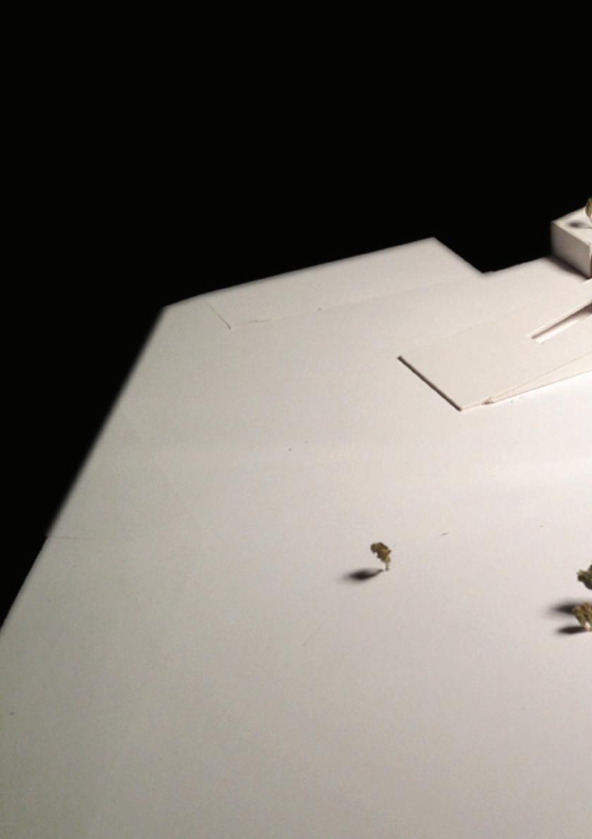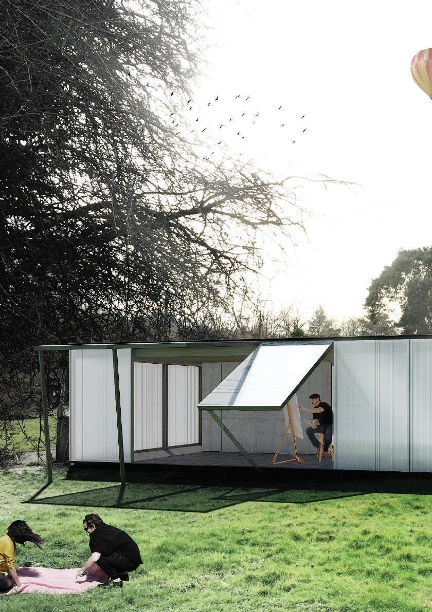 Der Schuppen an sich, ...distanziert sich aufgrund seiner Gestaltung bewusst von seinem bestehenden Gebäude um sich eindeutig zu etwas Neuem zu bekennen. Bezüglich seiner Form nimmt sich das Gebäude zurück um den Fokus auf die Kunst zu richten, die innerhalb seiner Mauern gescha en werden soll. Die Fassade umhüllt sanft den arbeitenden Künstler, von Innen nimmt es jede Ablenkung weg wie ein geschlossener Vorhang. Wenn sich der Künstler durch die Natur inspirieren lassen möchte, können die Fassadenelemente geö net werden um eine starke Verbindung mit seiner Umgebung zuzulassen. Die Dachkonstruktion funktioniert wie eine Brise Soleil und so befindet sich der Künstler immer in einem sehr angenehmen di usen Lichtverhältnis.