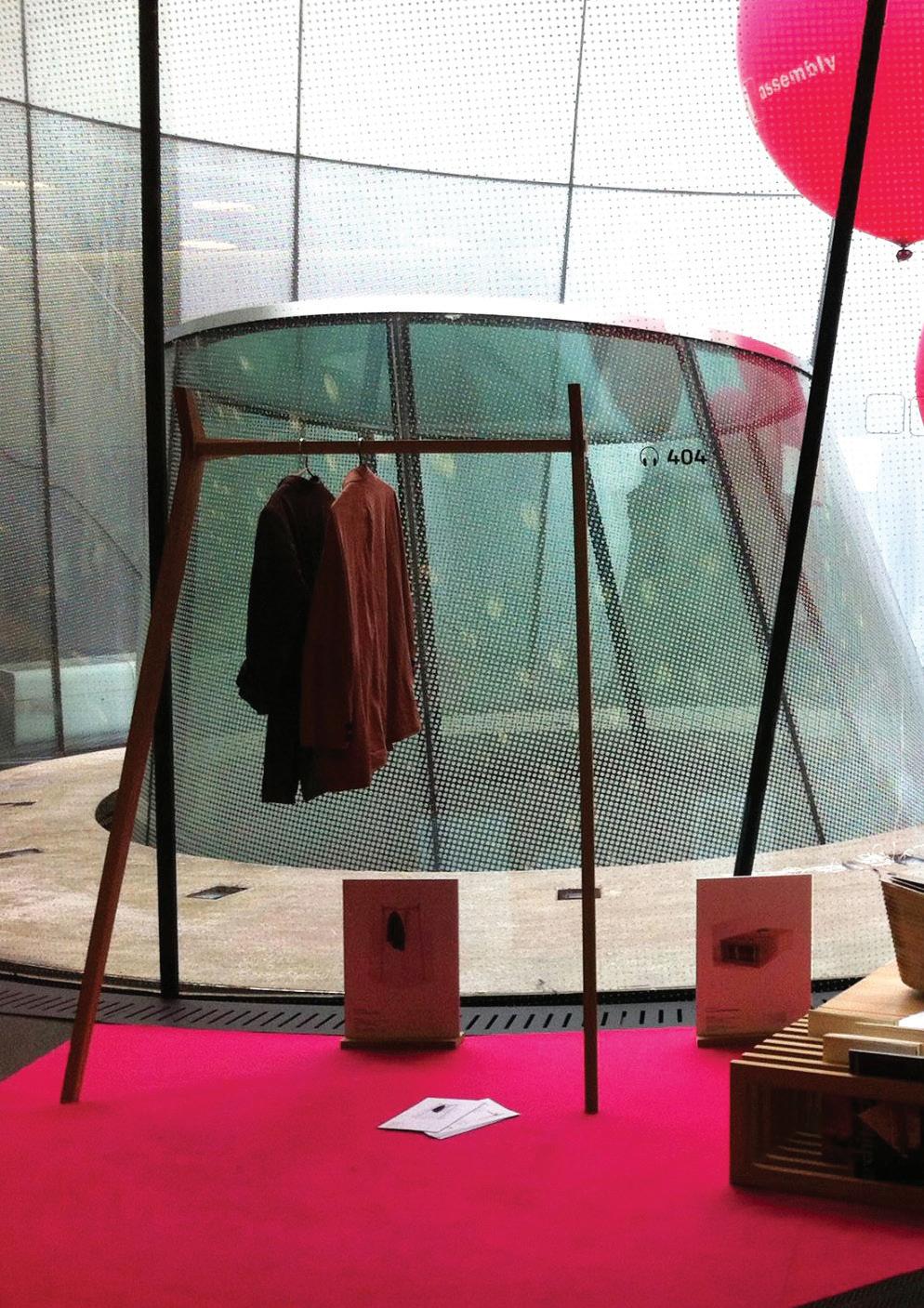 Facing the challenge to design a wardrobe I decided to see it more as an exhibition of clothes. Therefore the themes „presentation of clothes“ and „light“ seem to be intrinsically tied together. Guided by that idea I developed the lighting ficture itself as a hanging wardrobe. It works both sides: The clothes and jackets are each exhibited in a very unique way and the light changes in appearance with every di erent fabric.