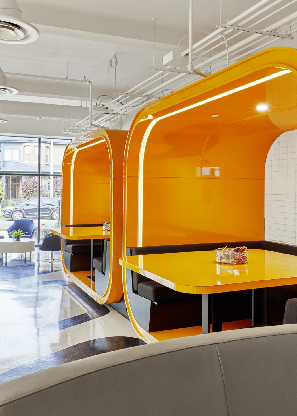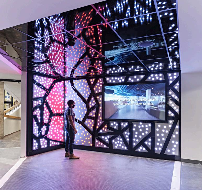 Reflective tiles and ceilingmounted floral installations brighten the interiors, while cozy student pods are thoughtfully integrated along formerly unused walls, offering private, functional study spaces. This project reimagines campus flow and revitalizes student engagement with Humber’s core spaces.