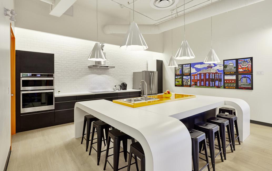 I also transformed a previously neglected corridor into a dynamic “Tech Zone,” inspired by the video game Snake. Corian posts formed a continuous line for countertops, complemented by white floor tiles for a cohesive look.