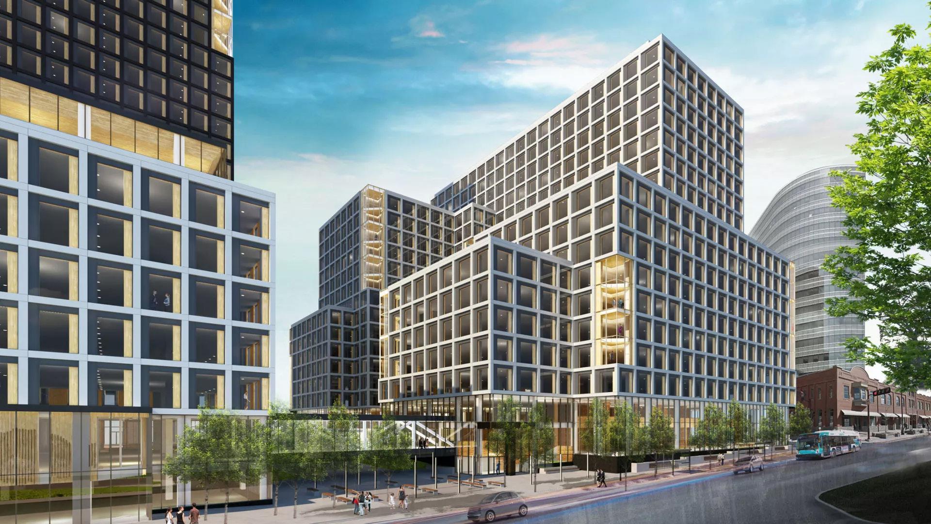The Envelope Replacement Project involved replacing the building’s deteriorated brick exterior and windows with a modern façade of curtain wall and porcelain panels.