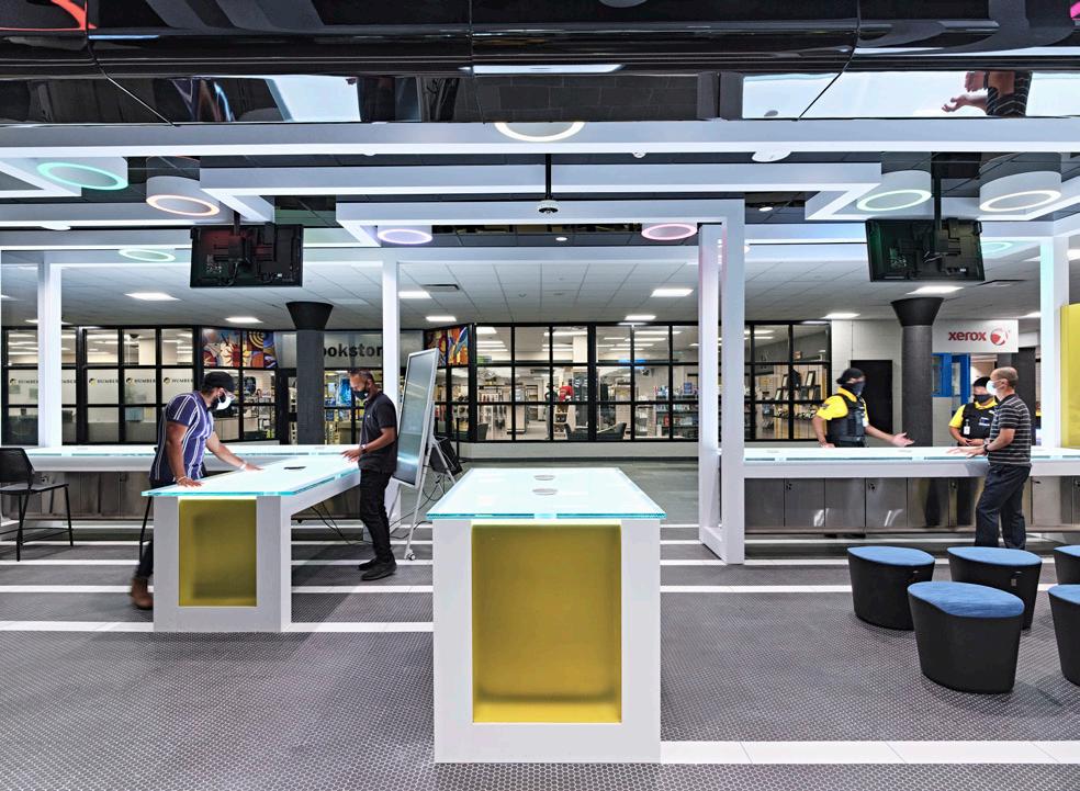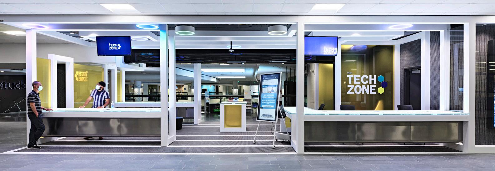 Opening-up one of the busiest corridors at Humber College with a bright, vibrant Tech Zone. Taking inspiration from the video game 'Snake', the Corian posts are one continuous line forming the countertops and continuing along with the white floor tiles.