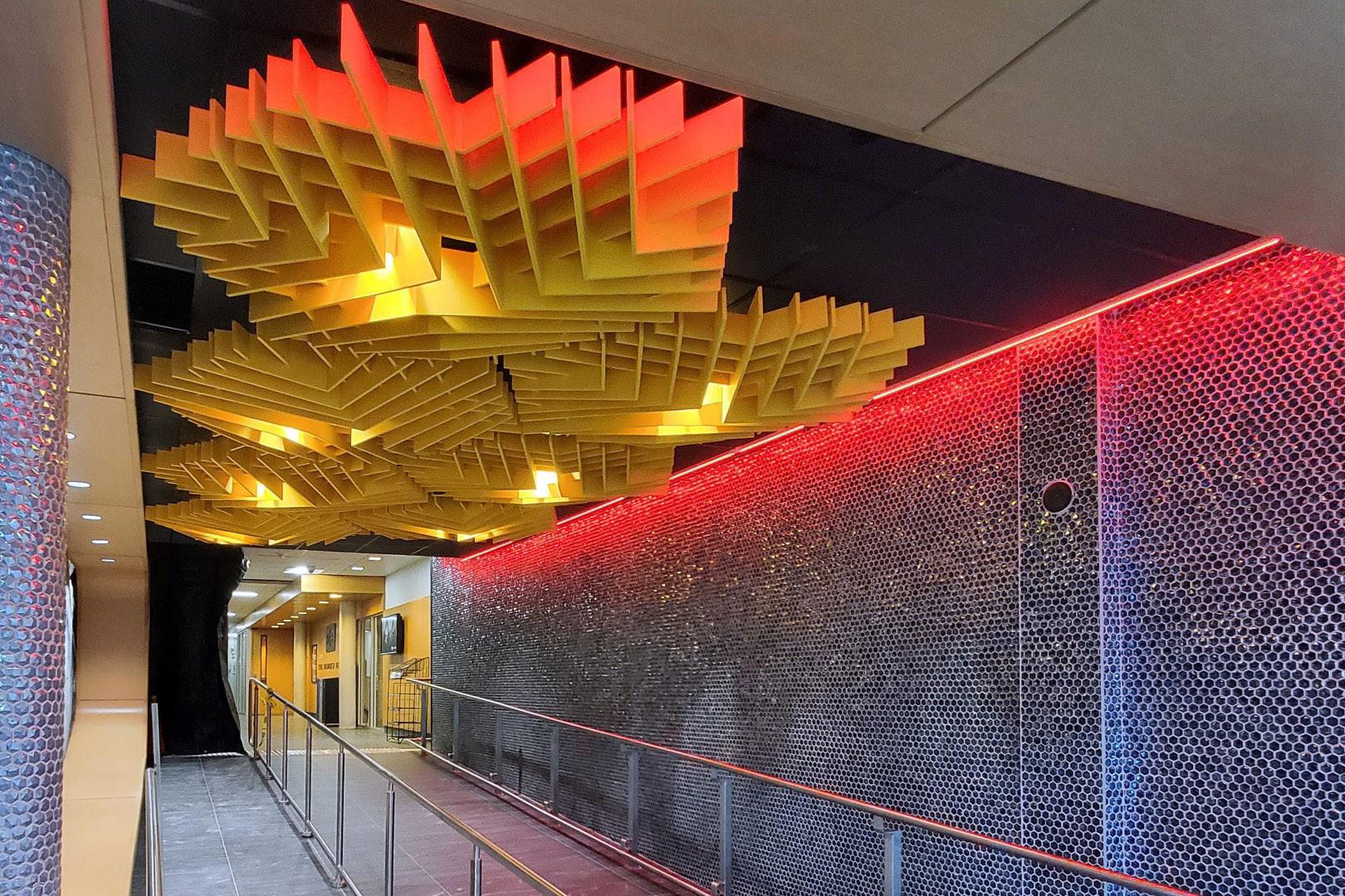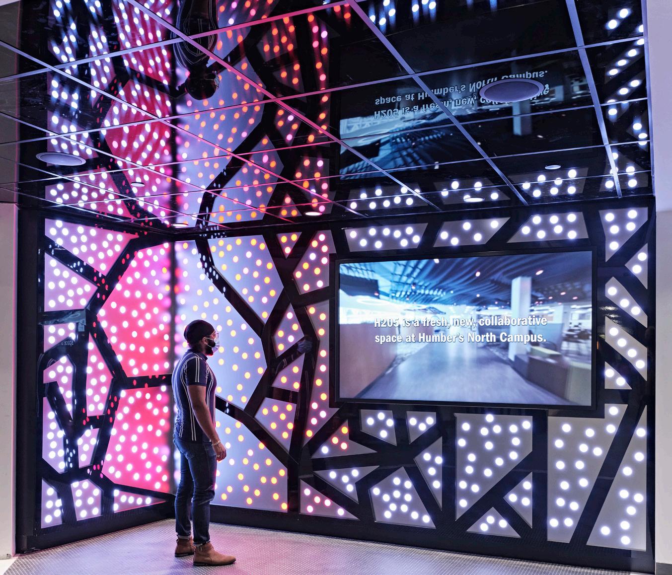 Thus came the development of a blank wall into an immersive, interactive display with full RGB LED lights that interact with users as they pass by the wall, cycling through different patterns throughout the months to represent the theme of that month.
