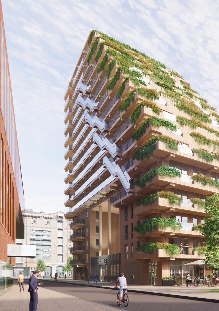 What is exceptional about SAWA is that the building is built entirely in CLT (cross laminated timber) and Glulam (laminated timber), with the use of concrete kept to a minimum. This makes SAWA the first all-height wooden residential building in Rotterdam. The building is distinctive in its appearance because of the generous green terraces, which refer to the history of the location while enhancing biodiversity in the neighbourhood.