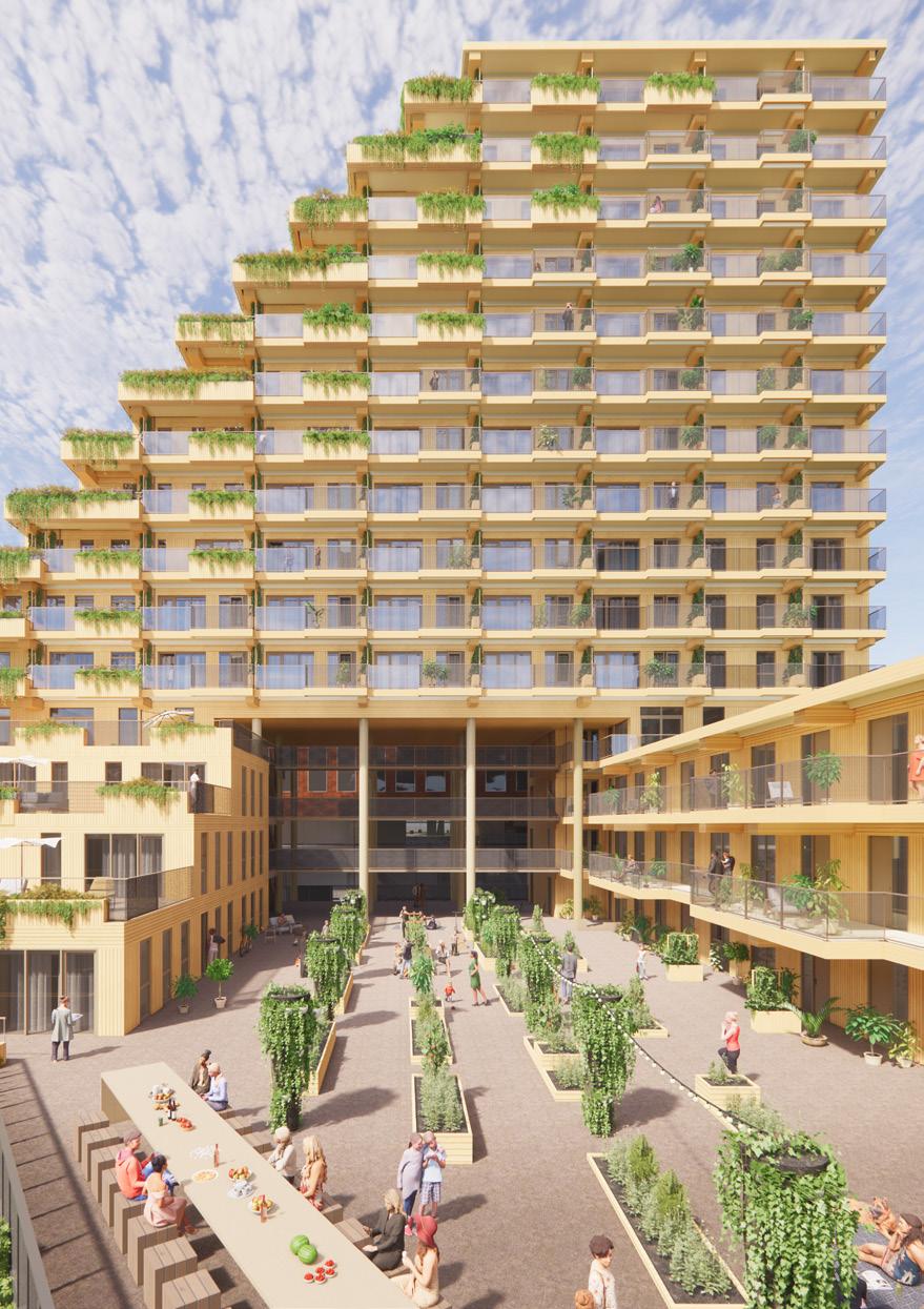 The NICE Tower, with an impressive height of 140 meters high and constructed entirely of wood, is the next step in the revolution of circular wooden high-rise buildings. The tower derives its stability from the wooden braces in the façade and the wooden elevator core, is completely biobased and free of concrete from the first floor to the elevator core and supporting structure. As a result, the CO2-emissions drastically reduced compared to traditional concrete buildings and helps combat global warming.