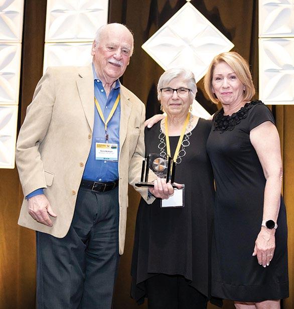 Denis, Mary Ann and MDA President Janet Cummings pose with their award at the 2023 MDA Bi-Annual Convention.