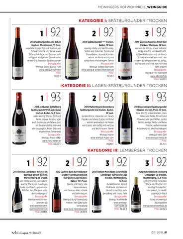 2014 Spätburgunder *** trocken, Baden, 13 %vol. speckig-röstig und leicht nussig, Noten von Holunder, Cassis und Preiselbeere, dezente Kräuter würze; im Mund würzig und saftig-herb mit körnigem Tannin Bezugsquelle: Weingut Schloss Eberstein www.weingut-schloss-eberstein.de Preis: 35,50 €
