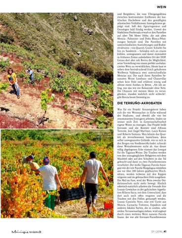 WEIN und Bergtälern, die vom Übergangsklima zwischen kontinentalen Einflüssen der kas tilischen Hochebene und den gemäßigten atlantischen Verhältnissen Innergaliciens ge prägt sind, ließ den Agraringenieur und Oenologen bald fündig werden. Unweit des Städtchens Ponferrada erwarb er drei Parzellen auf über 700 Meter Höhe, die mit alten Mencía-, Palomino- und Doña Blanca-Pflan zungen bestockt sind. Die Parzellen mit unterschiedlichen Ausrichtungen und Boden strukturen – von Quarzit, Granit, Schiefer bis hin zu Sandstein – befinden sich an einem kühlen, unwegsamen und damit zumindest in früheren Zeiten unbeliebten Ort der DOP. Genau dort aber sah Rovira die Möglichkeit, seine Vorstellung von einem perfekt ausbalan cierten Wein zu verwirklichen. Heute baut er neben dem beeindruckend frisch gehaltenen Weißwein Valdesacia zwei unterschiedliche Mencías aus. Die nach ihren Parzellen be nannten Weine Lombano und Chanovillar sehen kein Holz und erfahren einzig und alleine einen Ausbau in Beton. „Als ich an fing, war das wie ein Balanceakt ohne Netz. Die Chancen mit meinen Ideen zu verun glücken, standen wahrlich nicht schlecht“, gibt Rovira heute freimütig zu.