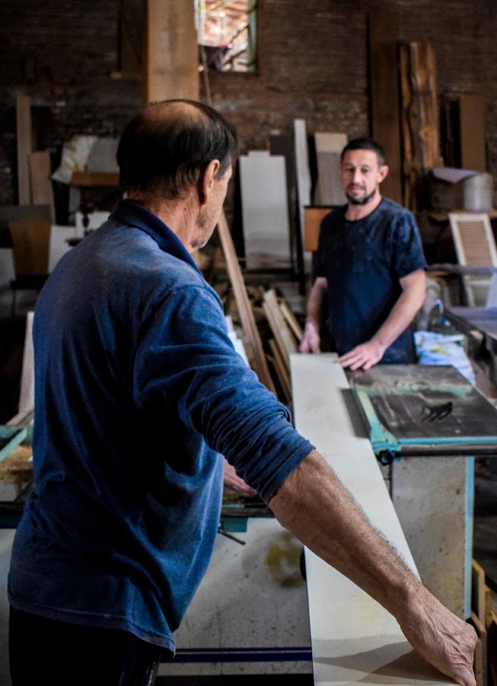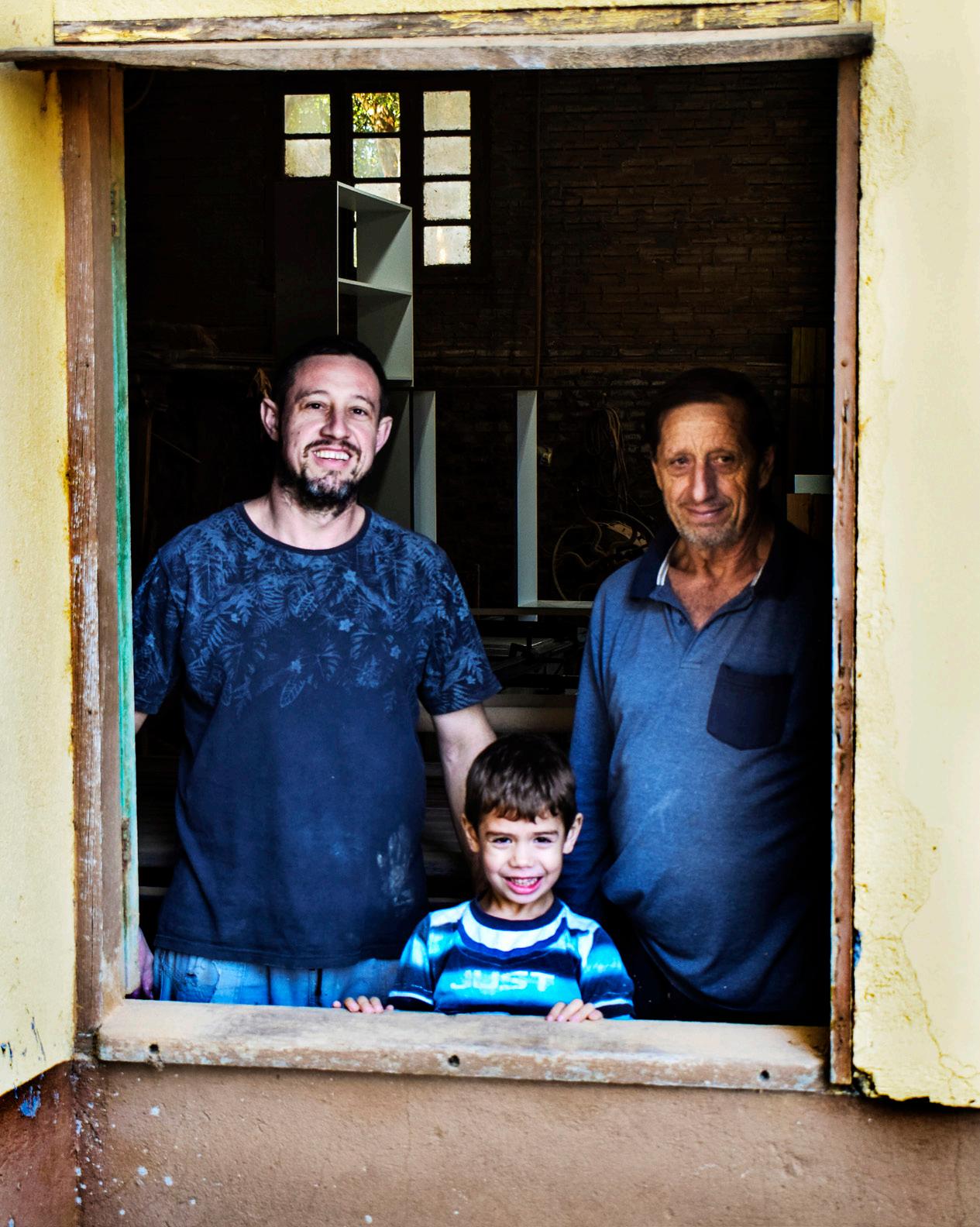Julia Cechin Isadora Torres Isadora TorresÀ direita, em sentido horário, Cleomar, Luiz Centenaro e Henrique Argenta. Na página ao lado, de cima para baixo, detalhe da mão de Luiz; as brincadeiras de Henrique na marcenaria e Cleomar e Luiz trabalhando. Na primeira página da reportagem, Luiz Centenaro Argenta