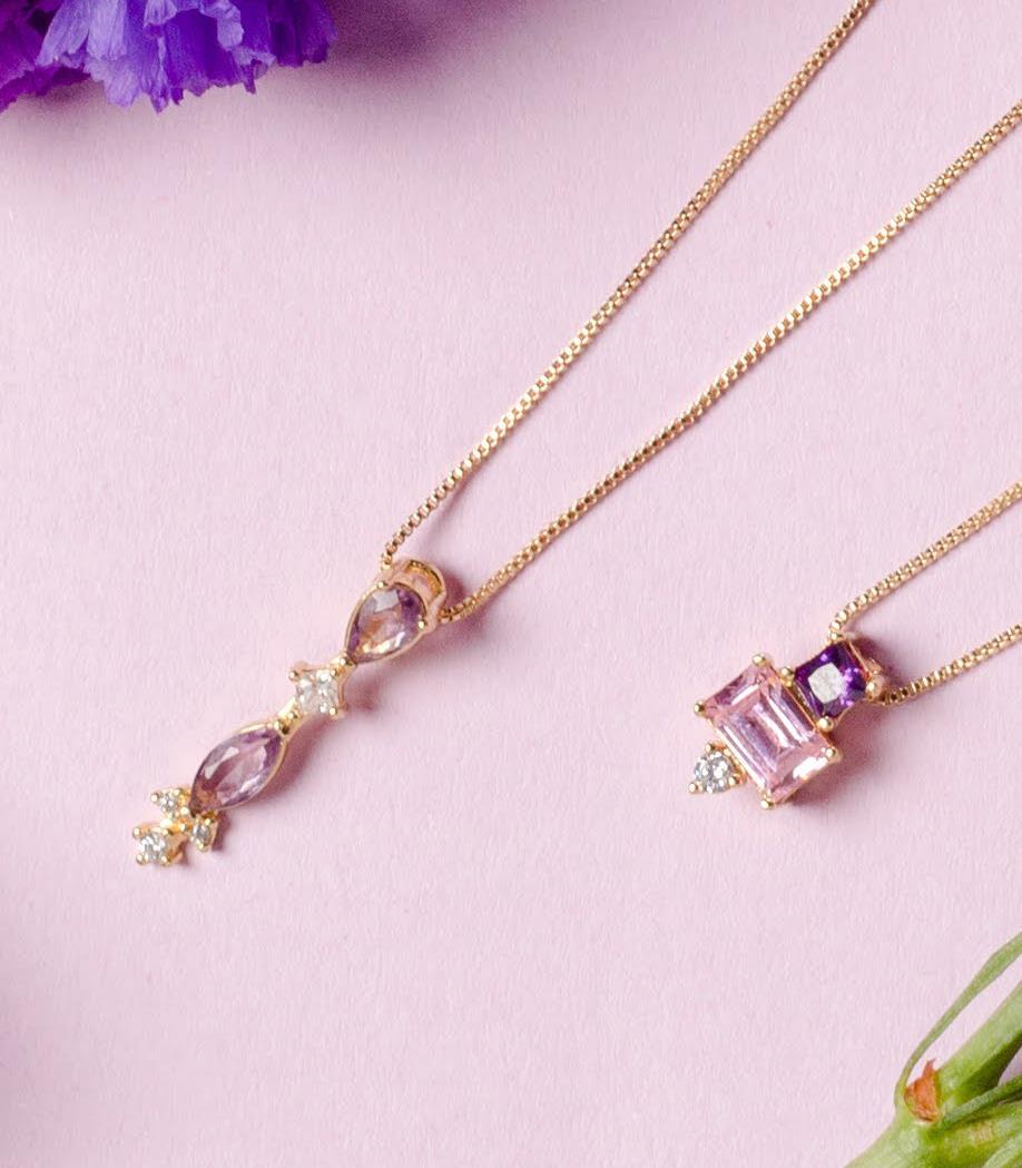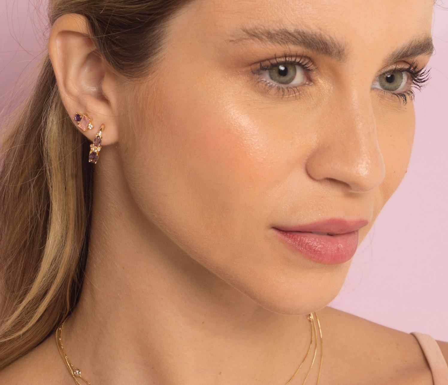 As joias da Stone Collection são de prata de lei com banho de ouro e zircônias, inspiradas nas tendências da cor Lavanda, e do retorno dos acessórios em prata e da valorização das joias em ouro.