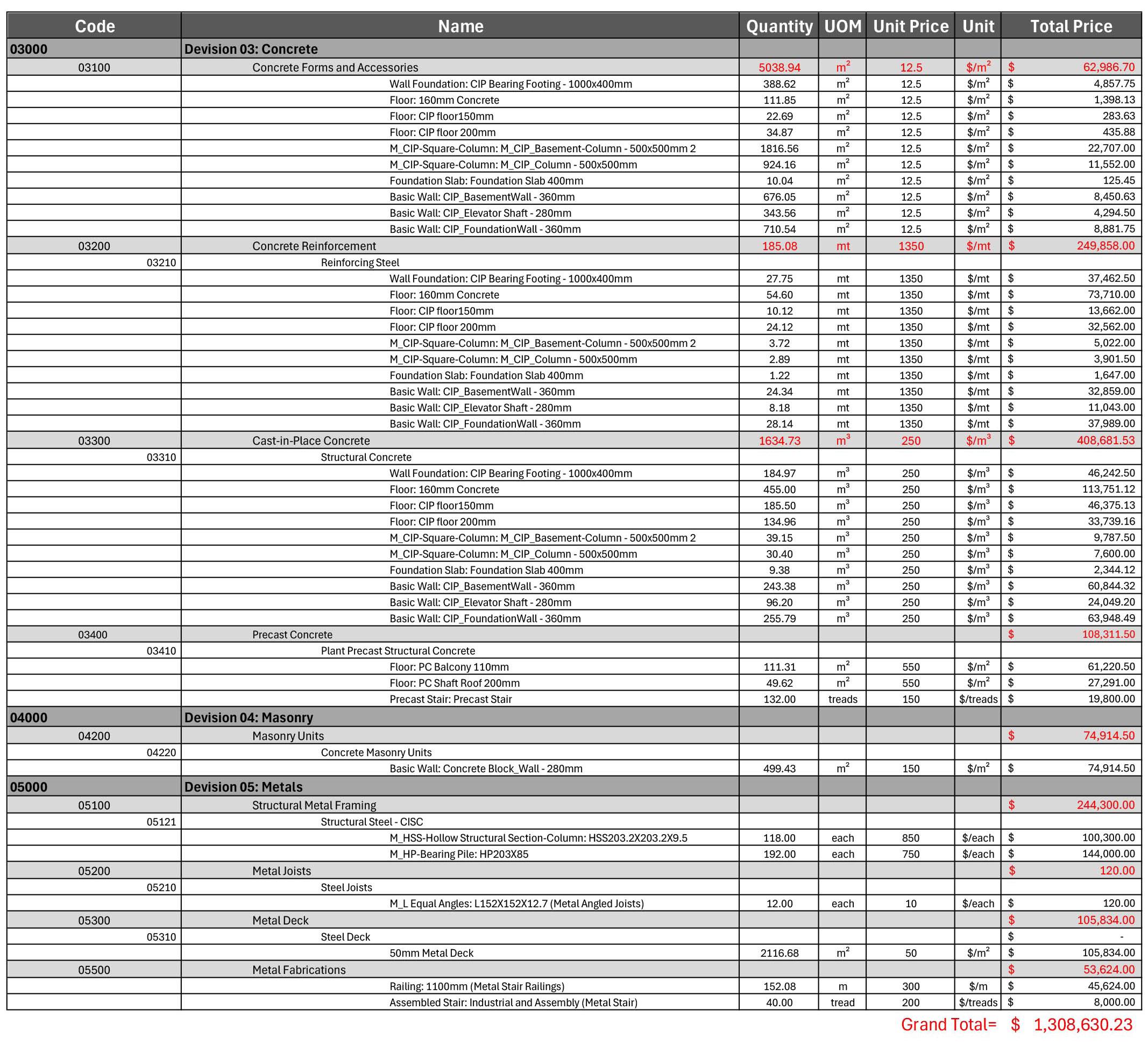 In this project, the challenge of performing accurate cost estimation and quantity takeoff for a structural model was addressed using Navisworks and Revit. A Quantification Workbook was set up in Navisworks based on Masterformat, and quantities for items such as rebar and formwork were calculated and exported to create a custom Excel-based estimate.