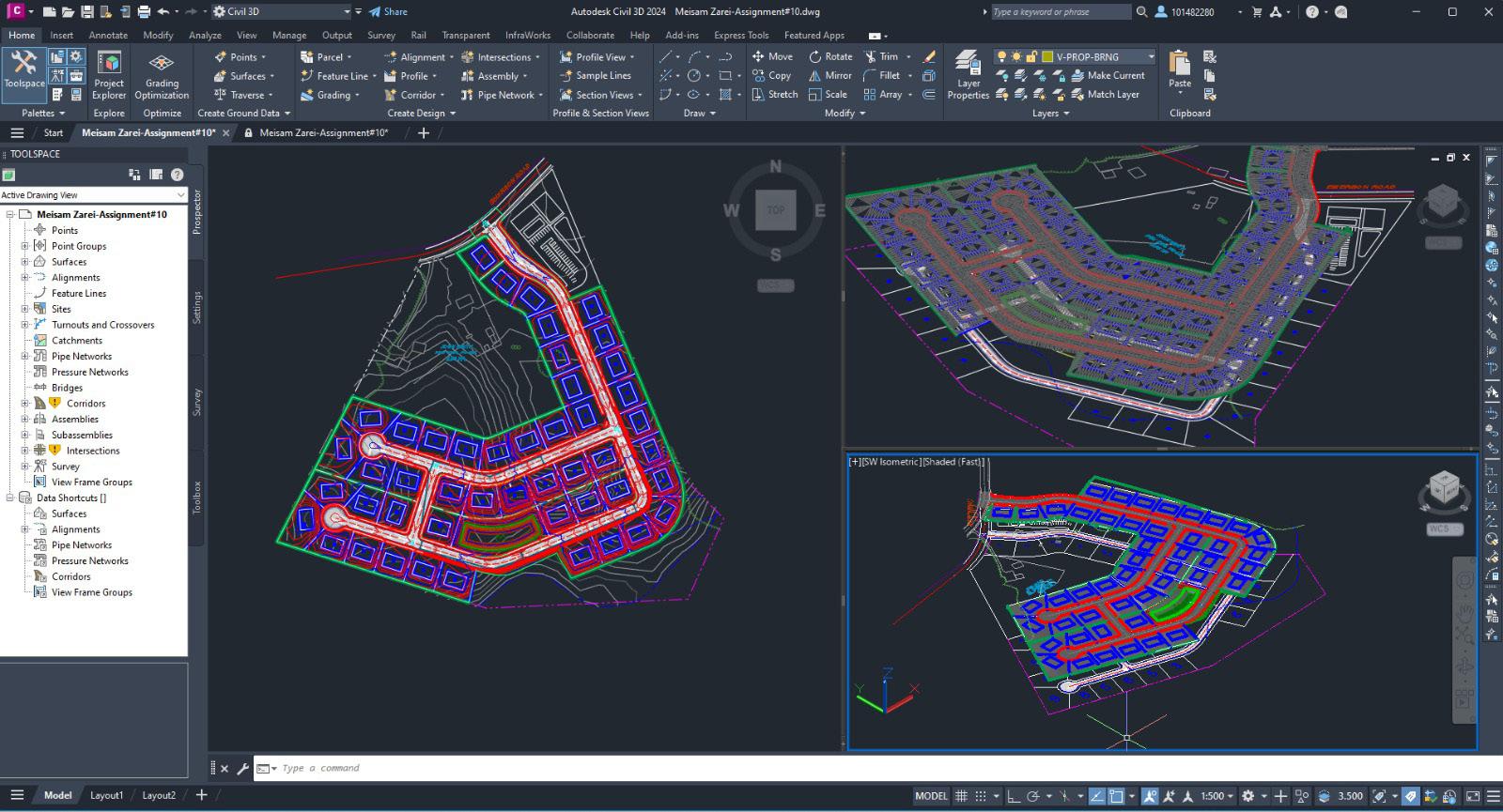 A full Civil 3D project was successfully completed, showcasing skills in corridor design, grading analysis, and utility network modeling. Alignment inconsistencies were resolved through precise adjustments and collaborative problem-solving. Conflicts in utility networks were addressed using advanced Civil 3D tools, ensuring a seamless design process. Material quantities and construction documentation were generated accurately, highlighting proficiency in Civil 3D workflows.
