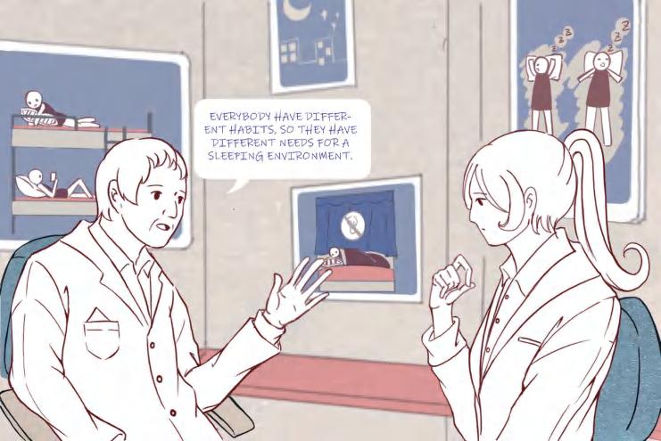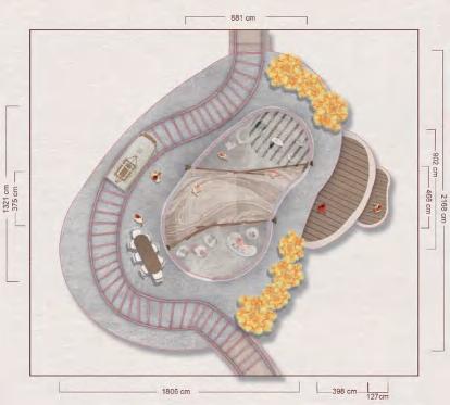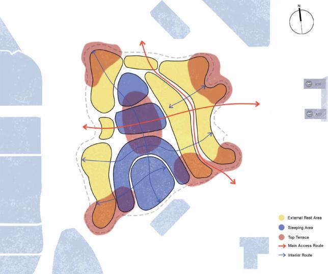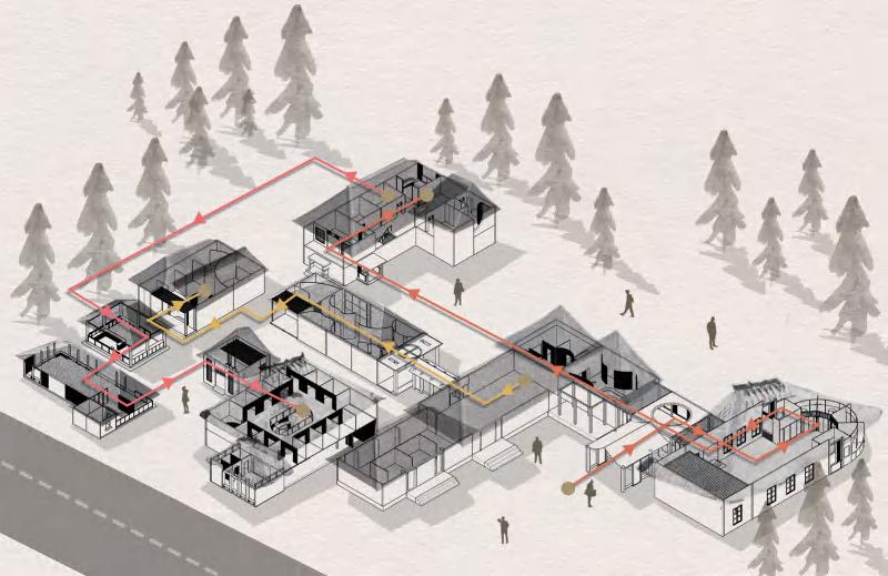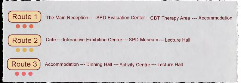Route 3 Therapy: The route for dermatillomania patients living in the accommodation area to travel to the treatment area. In the treatment area's activity room, patients will undergo cognitivebehavioral therapy and other rehabilitation activities, such as meditation.