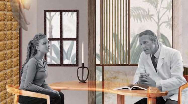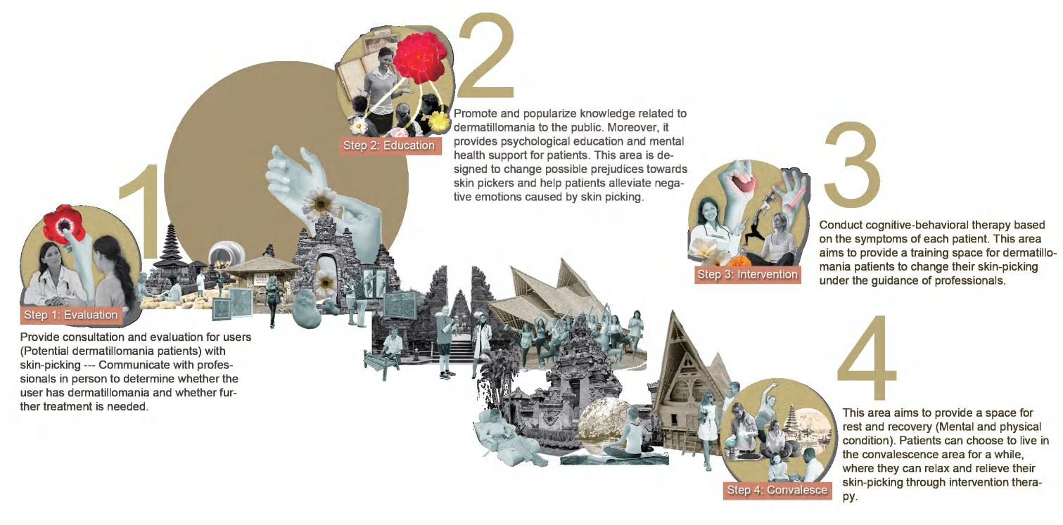 Route 1 Evaluation: Users who suffer from dermatillomania or suspect themselves of having dermatillomania will enter the meeting room for psychological counselling and dermatillomania assessment after registering at the reception and finally move into the accommodation to start recuperating.