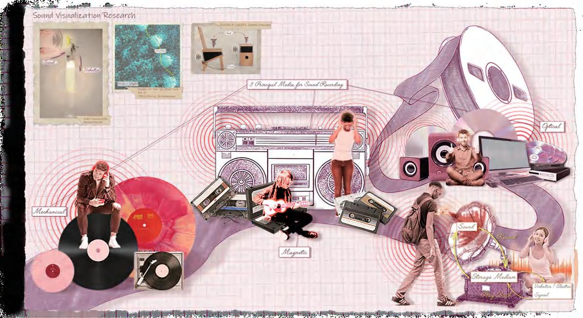 Conventional audio products usually collect sound through three mediums --- Mechanical media such as vinyl records, magnetic media such as audio tape, and optical media such as compact discs (CD). The principle of sound collection is to store the vibrations that produced the sound in a recording medium, which then converts those vibrations into sound and plays them back. Besides, there are also ways to record sound by transforming it into visual art, such as sound visualization videos. Converting sound waves into images to achieve sound visualization is common.