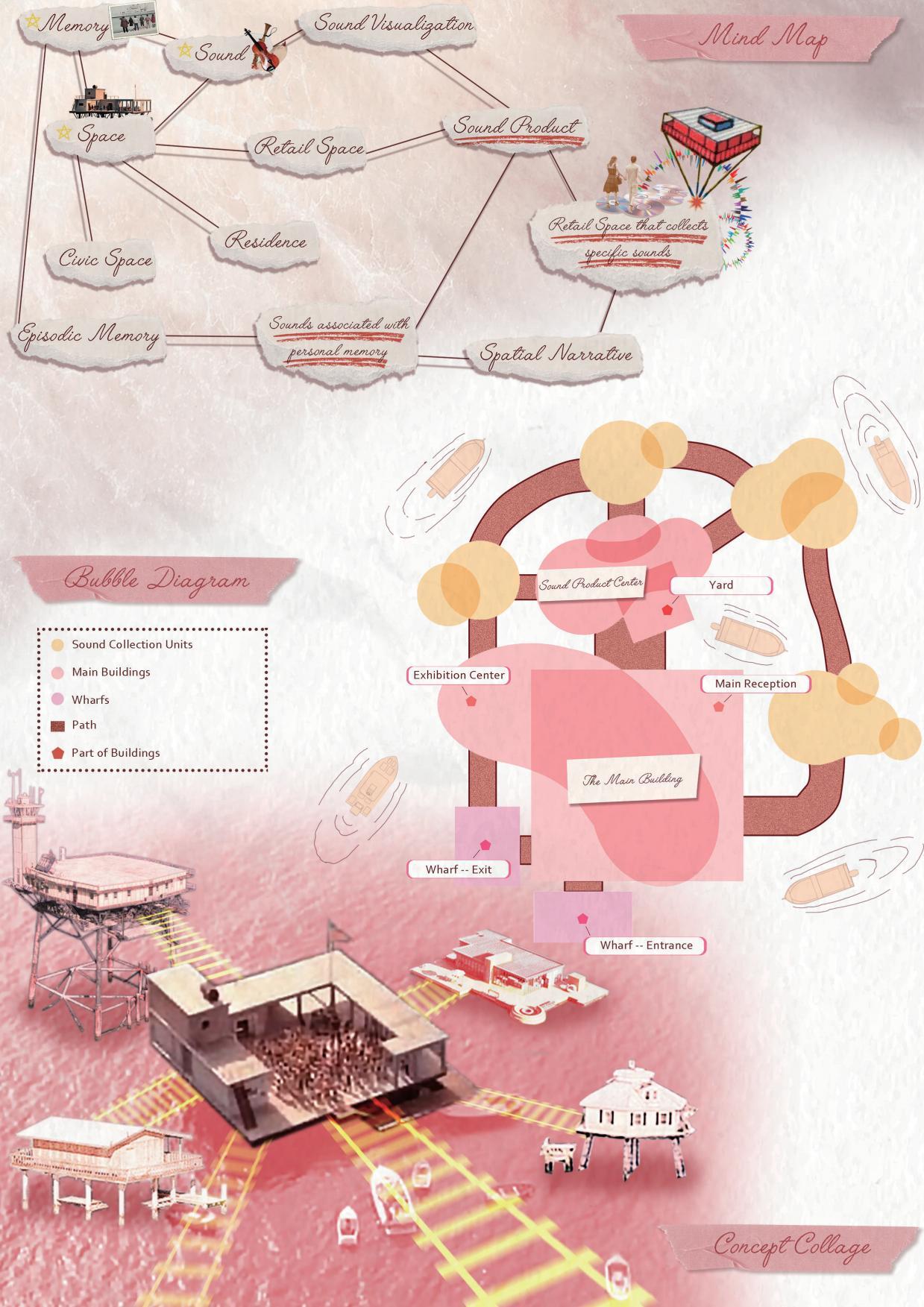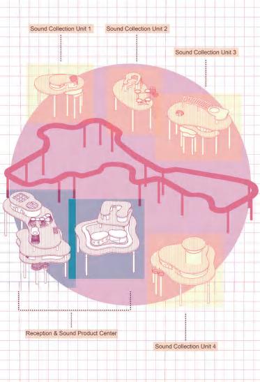 In this project, want my users to experience and collect sounds in space, combine them with their memories and obtain an object that can be preserved to represent these sounds and memories. Therefore, developed the design concept of "Audio Memorial", a combination of retail, leisure and interactive space. Users will travel among a group of sound collection units when they enter the space. These sound collection units will be associated with the surrounding environment, improving the sensory experience of sounds from the site. Users will interact with sounds and collect the sounds they want, then transform these sounds into monumental products (Audio Memorabilia)