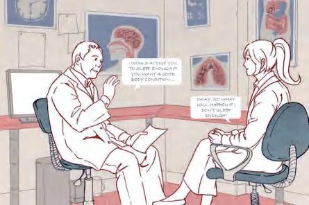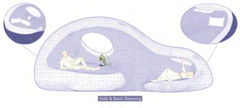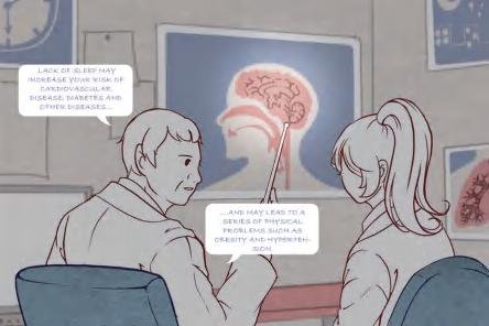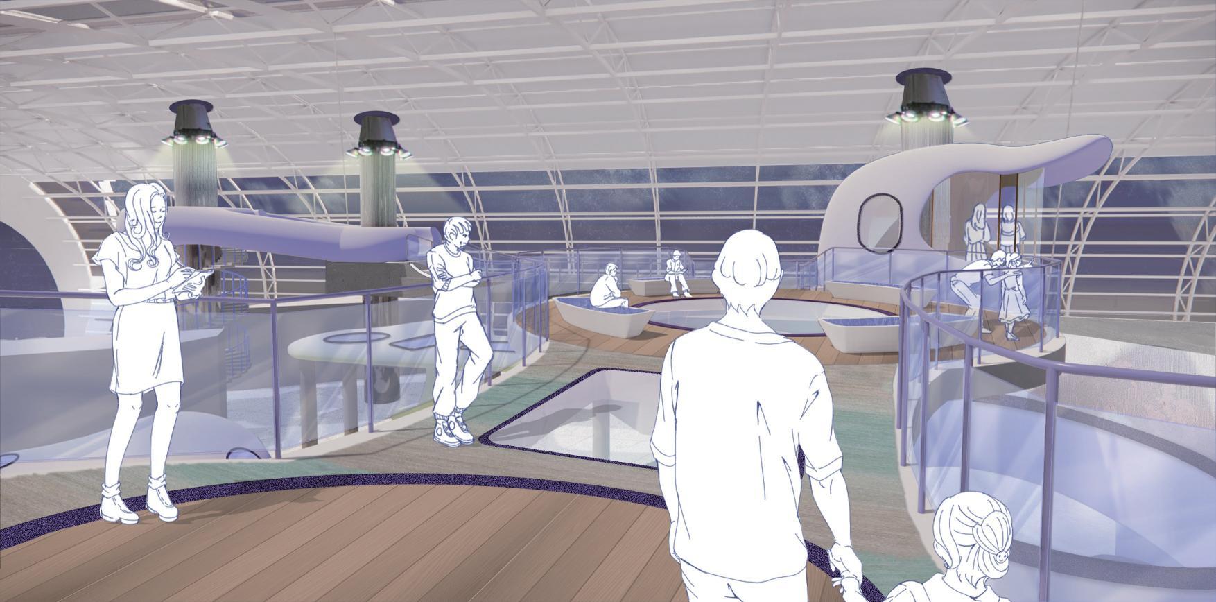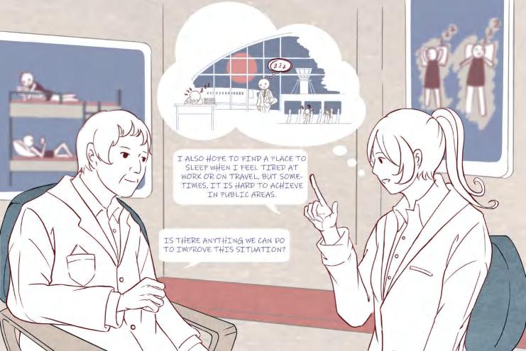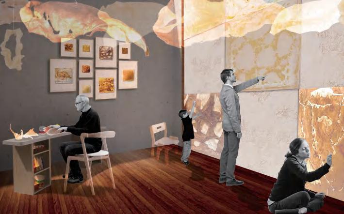 Route 2 Education: Visitors will pass through the cafe and enter the exhibition area. A series of exhibition halls and lecture rooms are open to the public, providing visitors with knowledge on dermatillomania.