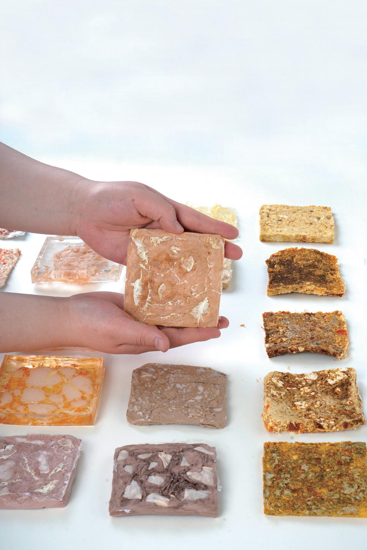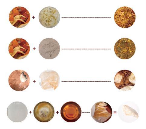 Grinding dried orange peel into powder or fragments of different sizes and mixing them with adhesive (UHU glue) can produce orange peel bricks with different textures. However, experiments have shown that using only orange peel to make bricks can make the material too brittle, but mixed auxiliary materials can increase its hardness. Bricks mixed with pulp have beautiful textures but are prone to bending. Mixing ultra-light clay can enhance the toughness of bricks. Clay might be a good choice for auxiliary materials --- The orange peel brick mixed with clay retains its texture and decreases its easy bending properties.