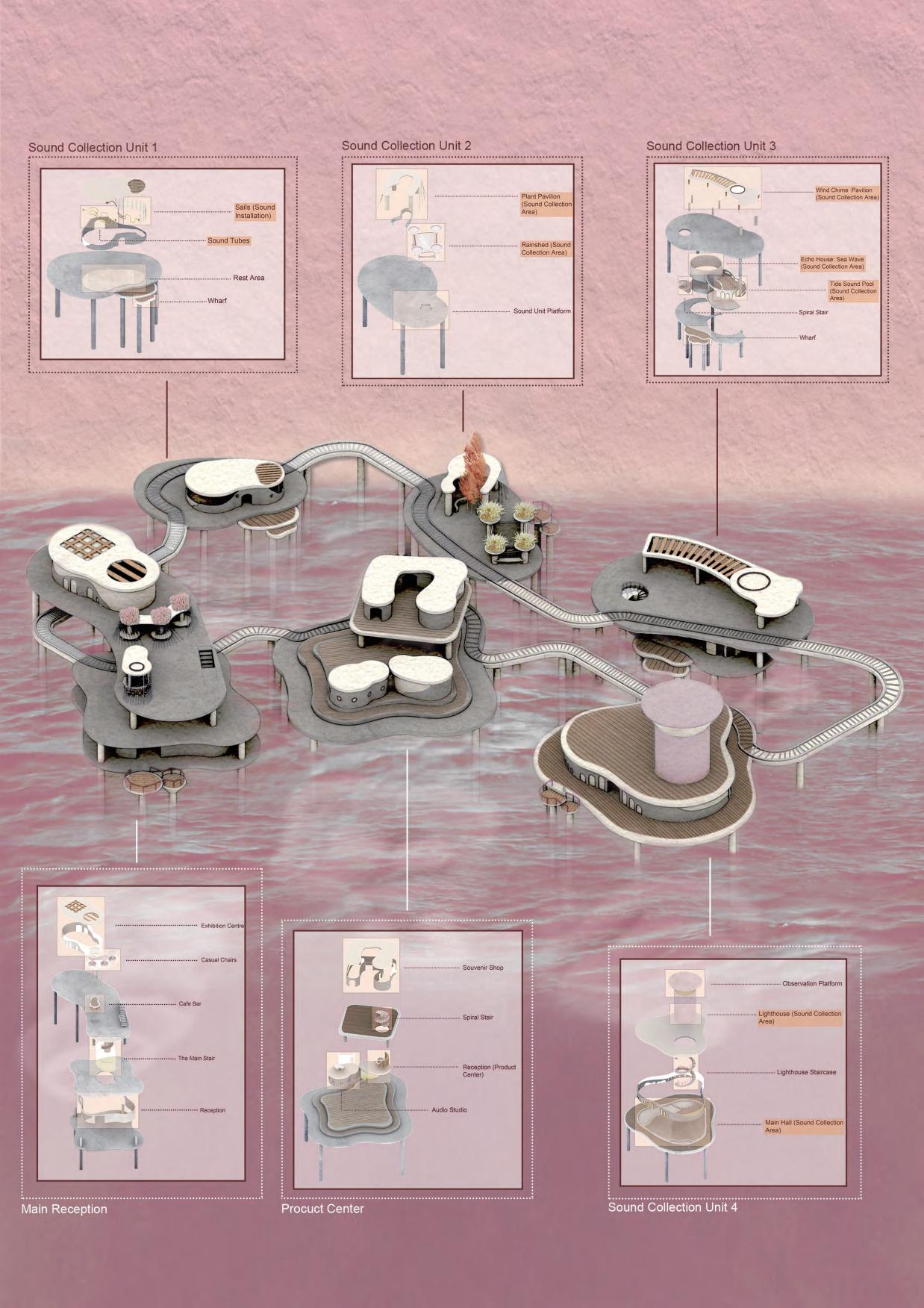 The Rosa Island: Audio Memorabilia is a marine architecture complex combining retail, leisure, entertainment, etc. The building is designed to explore the relationship between sound and memory. In this building, visitors can interact with different sound collection installations. Then, record the sounds they hear and preserve them in their preferred form.
