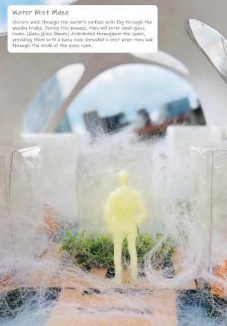 The Hazy Sunroom attempts to create a warm, humid, and natural atmosphere in the space. The interaction between water mist and sunlight in space gives visitors an interesting visual effect. Visitors can interact with the glass installations in the space while enjoying this unique visual experience.