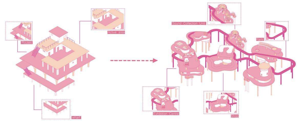 The Audio Memorabilia is designed according to Rose Island's original appearance and the culture of its location in Rimini, Italy. I combined my design philosophy and presented my own impression of Rose Island. I hope that tourists can not only interact with the sound installations in the building but also learn about Rose Island, which only exists in history and memories, by visiting this building complex.