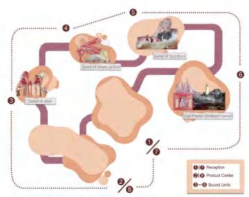 Users will experience a process of combining sound with memory in the Sound Memorial --First, they will arrive at the reception by boat and learn about the history of this building (Rose Island) and the experience of the sound space. They will then go to each Sound Unit by a small tram to experience and record the sound they like, and finally go to the production centre for the processing and productization of sound files.