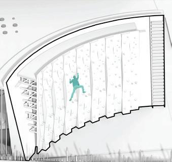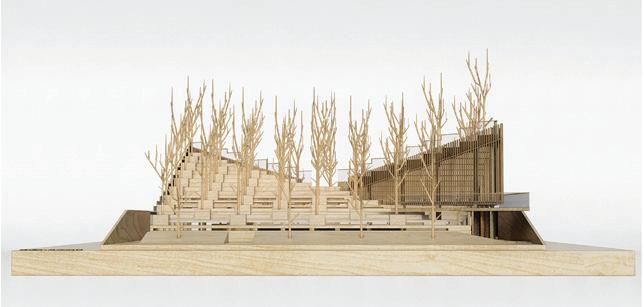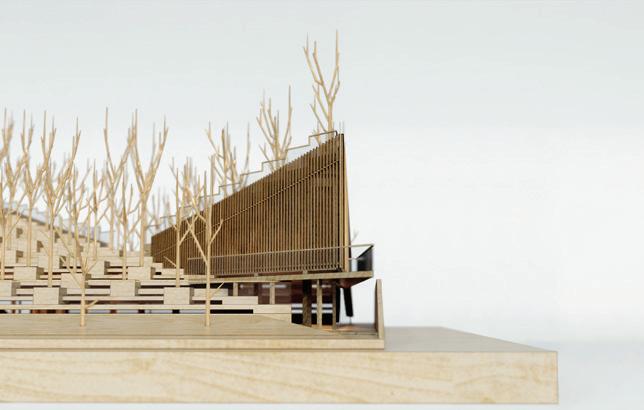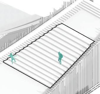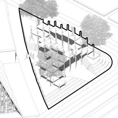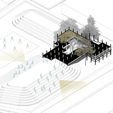 The multifunctional installation module supports activities like relaxing, exercising, and gathering. The sheltered area serves as a meeting space, while the roof is accessible to visitors. Stepped levels create spatial boundaries without the need for partitions.