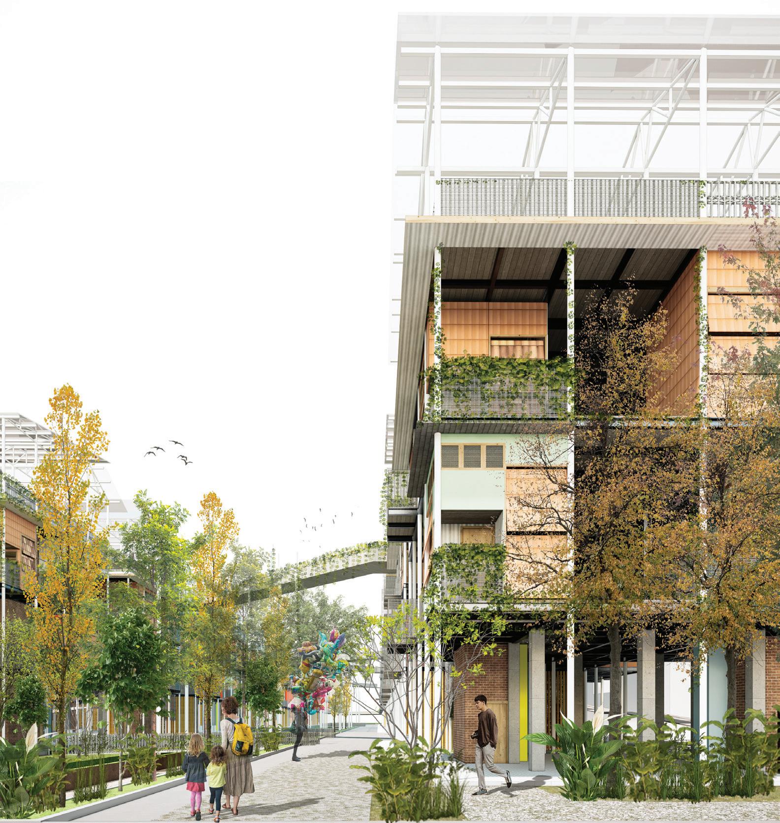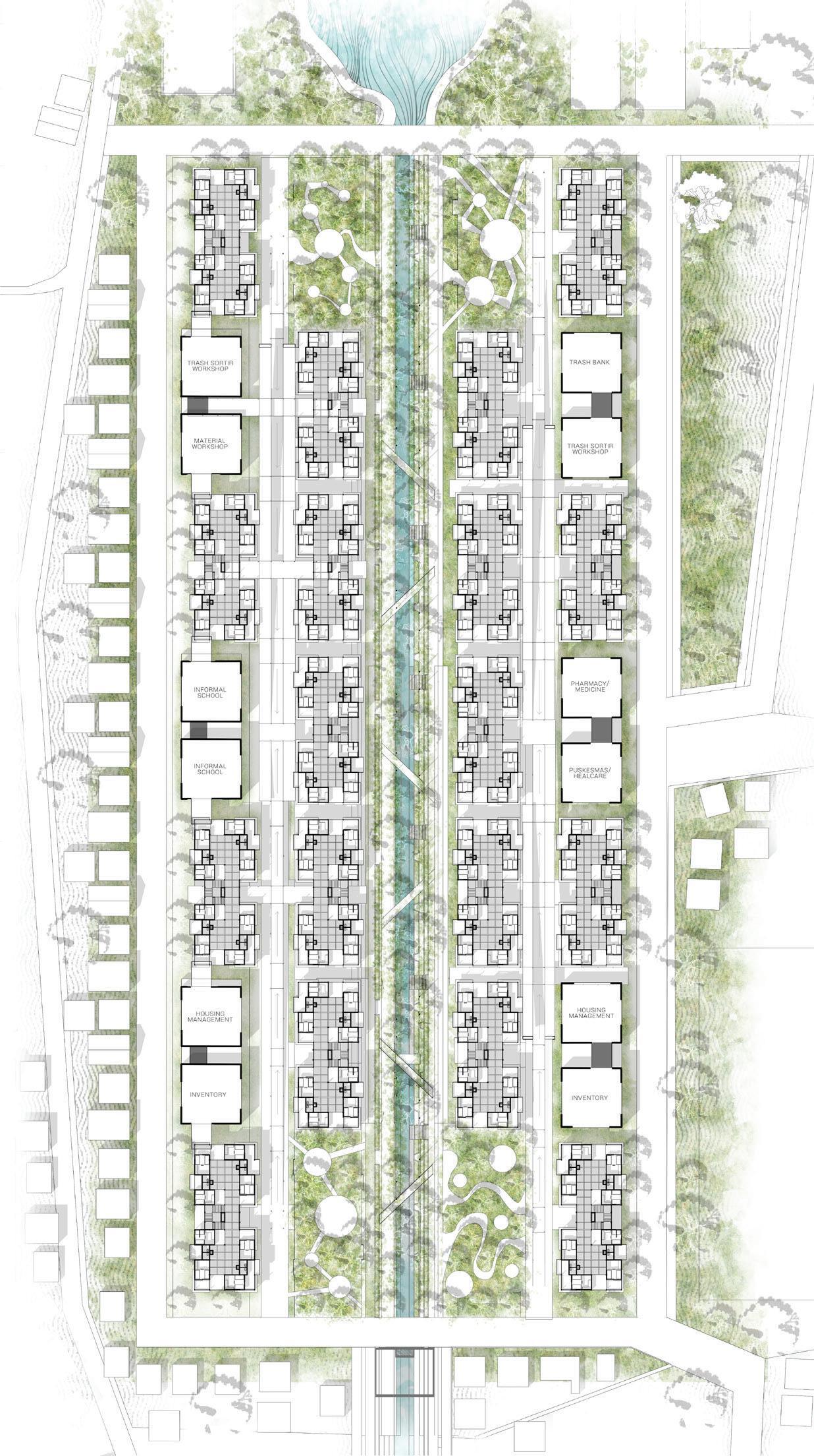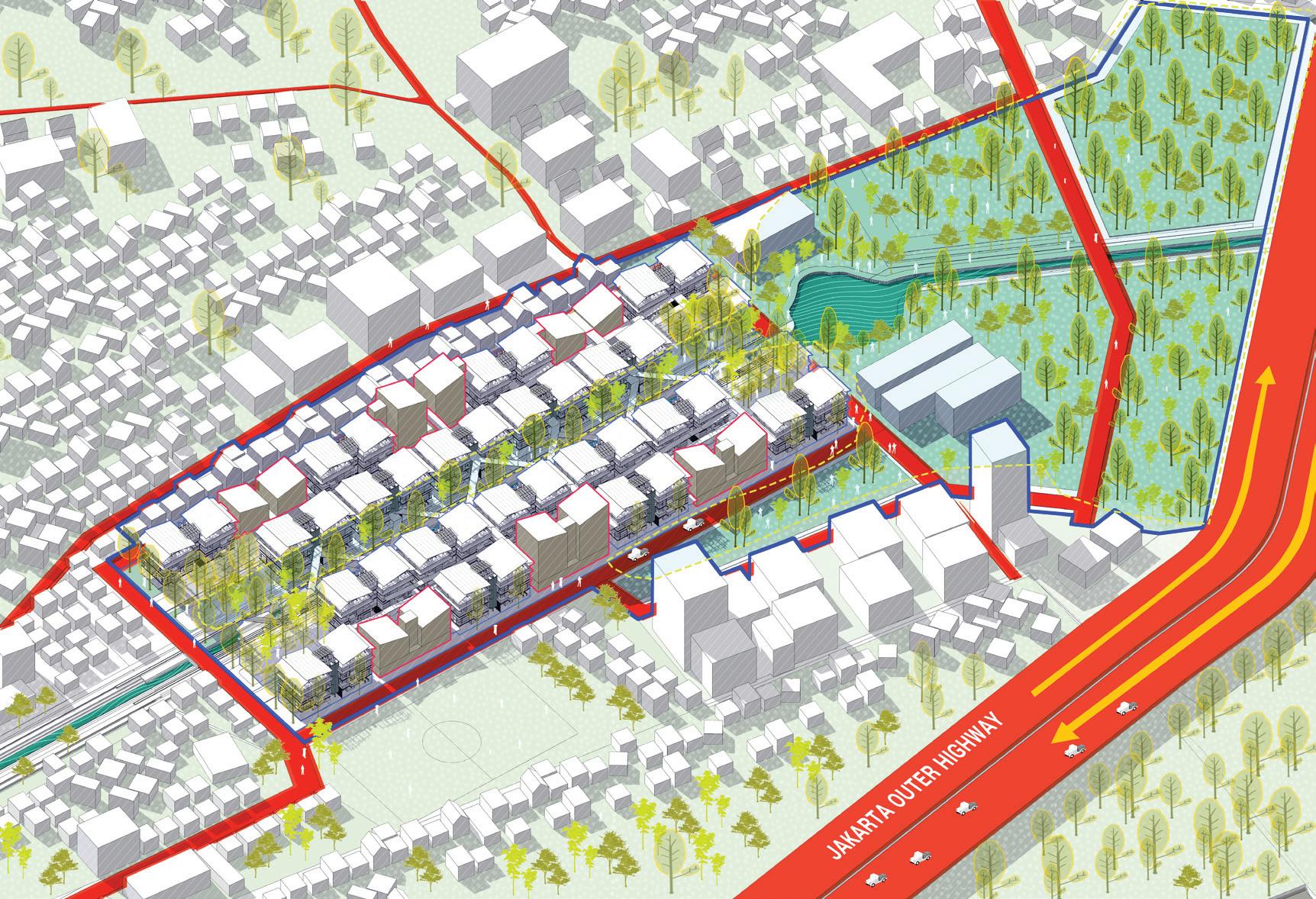 My primary role in the project was to focus on a formal design approach as a response to government policy, while also considering the potential of the existing site. However, within this formalization, I integrated an informal urban kampung approach commonly seen in Jakarta, characterized by flexible spaces, varying access, and the implementation of low-cost building strategies. Additionally, the design responds to the existing canal, embracing it as the starting point of the design. Instead of buildings oriented towards the street, each block is oriented towards and faces the canal, bringing life to the canal as a public space. A forest buffer zone separates the settlement blocks from the Jakarta Outer Ring Road, serving as a transition that connects with the canal ecosystem. This design approach fosters a harmonious relationship between people and nature, creating a balanced interaction between the built environment and the natural landscape.