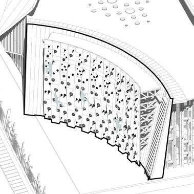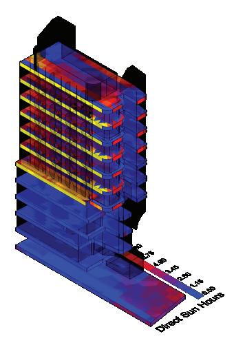 Additionally, I incorporated vertical greenery based on research that calculates the ideal ratio of plants to building occupants. This greenery was integrated into both the interior and facade. The facade design also focused on reducing heat from the western sun using passive cooling strategies.