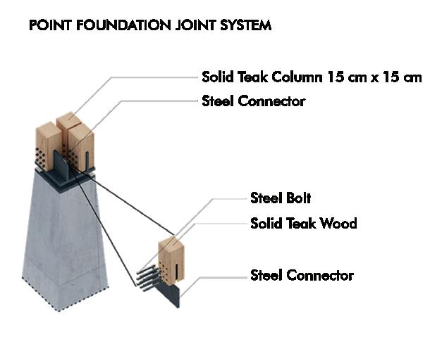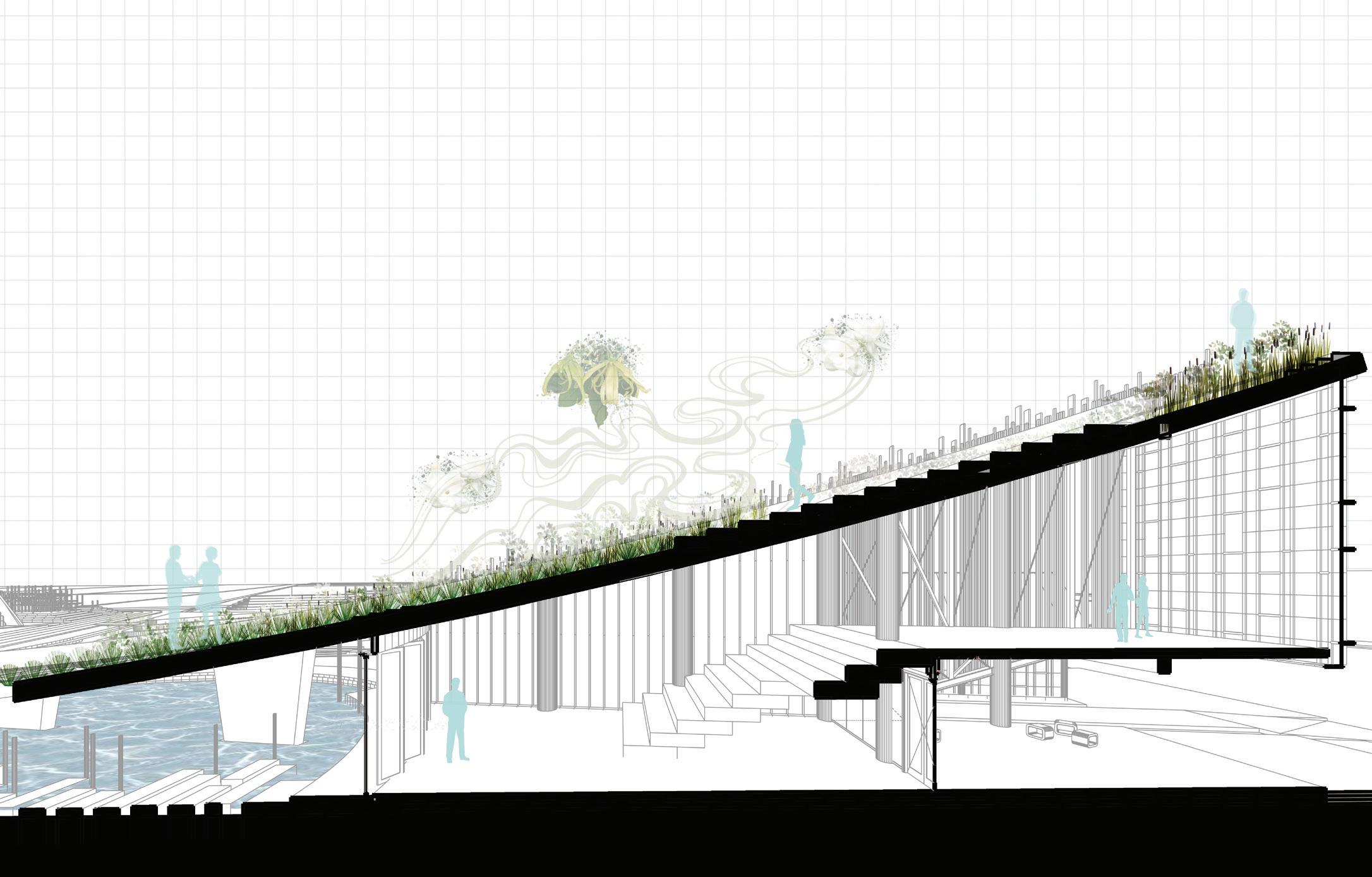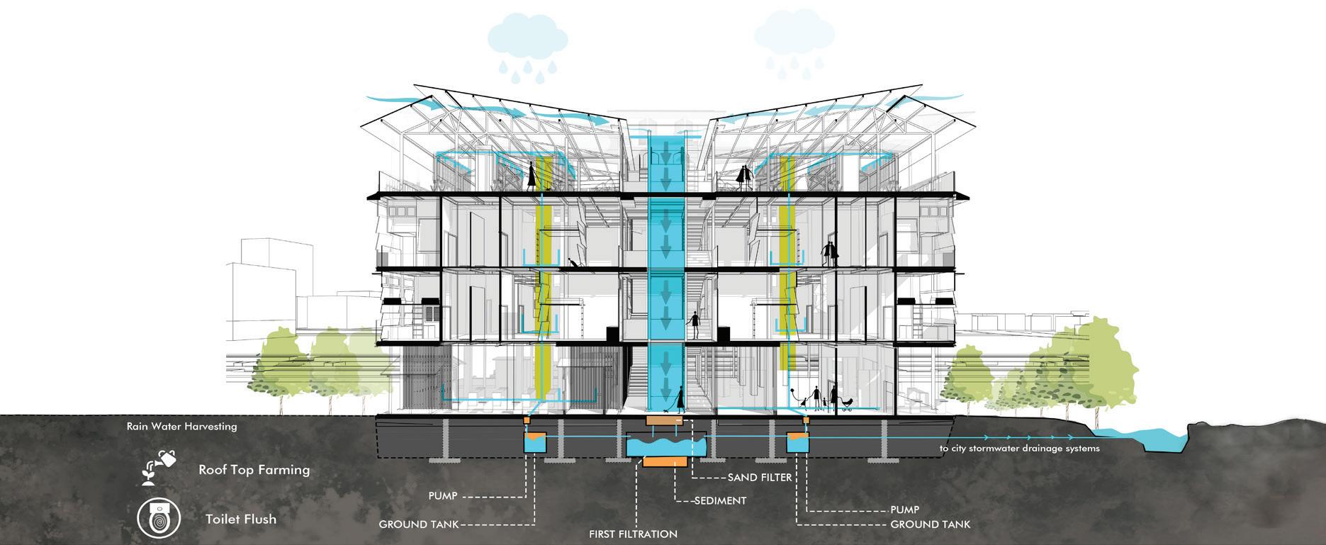 The rainwater harvesting system responds with the shape of a roof that catches rainwater and into a reservoir on the ground floor.