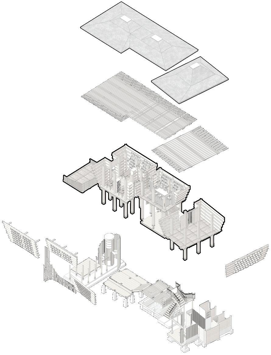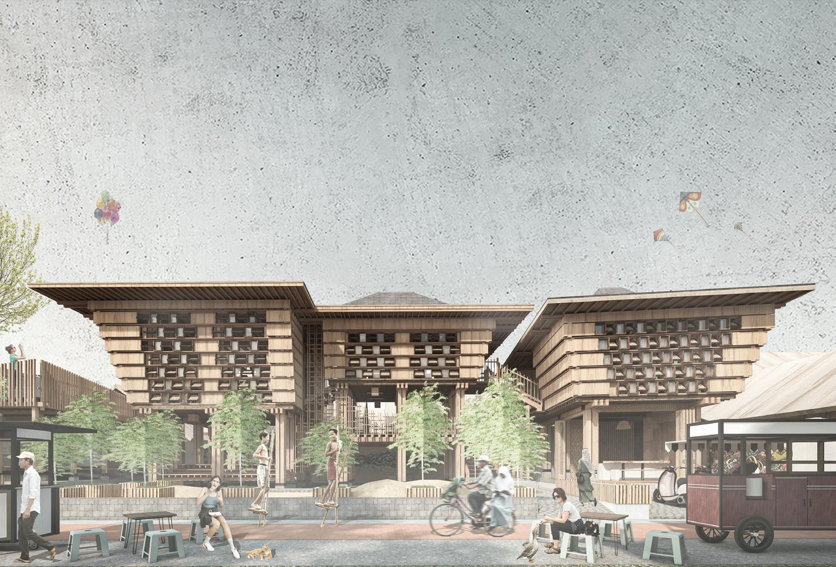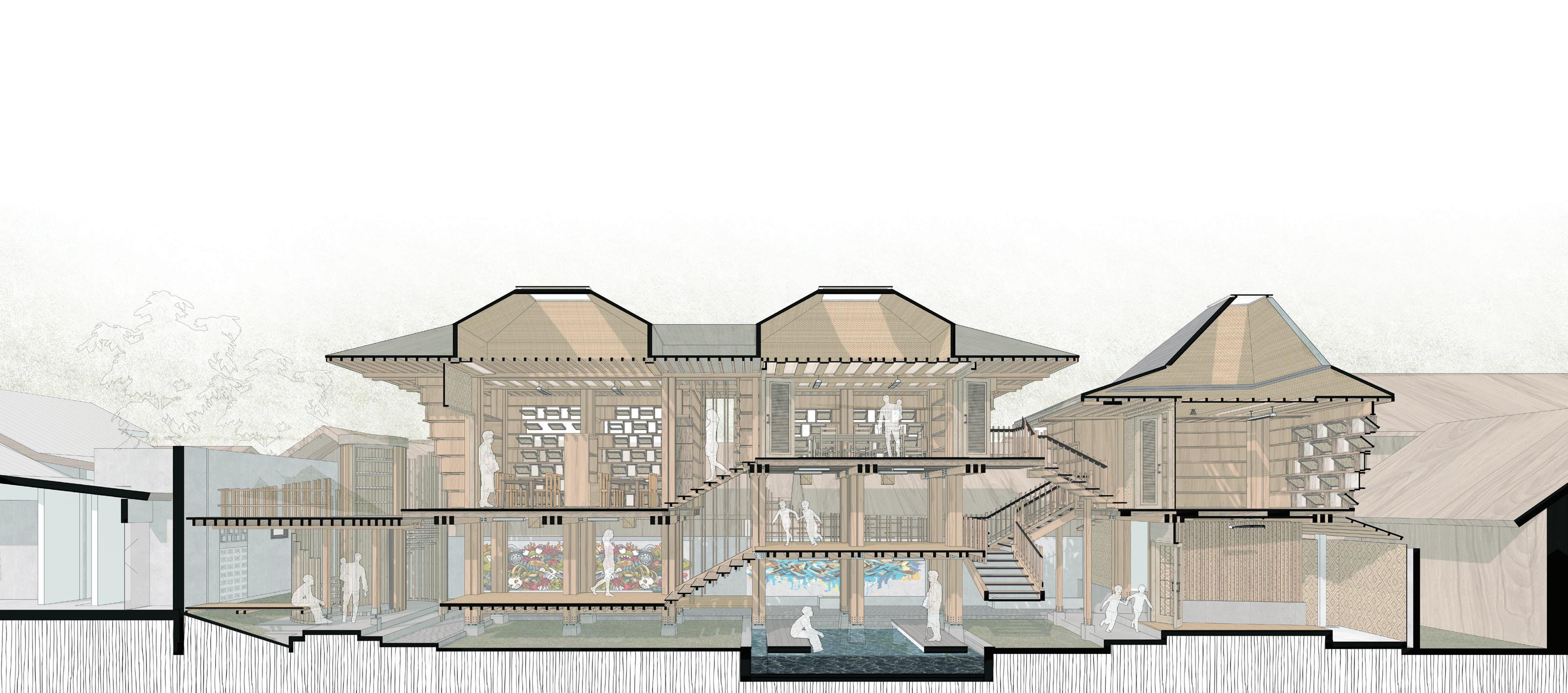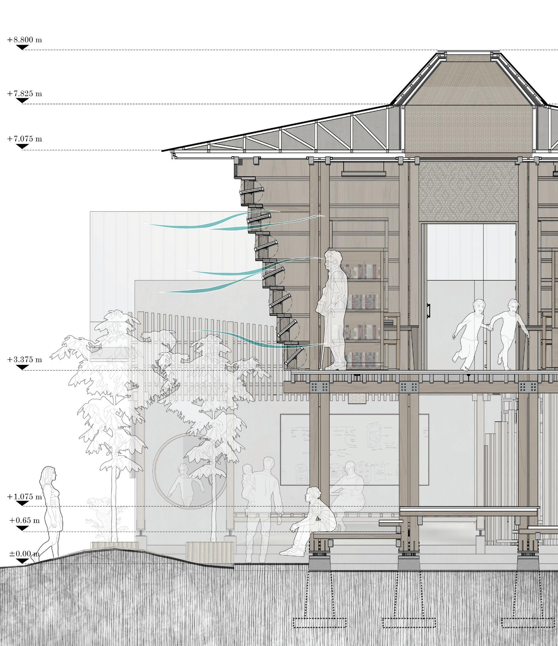 The project responds to socio-cultural values found on-site by adopting a multi-layered approach. The hierarchy of space is represented through the attachment of different areas and varying floor elevations, which distinguish space programs and their intended users. For example, the elder members of the community are placed in higher amben, reflecting their hierarchical status in relation to younger age groups.