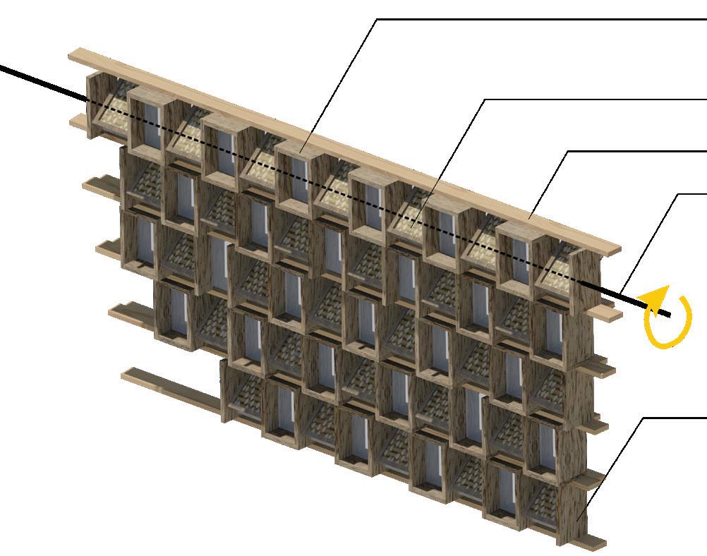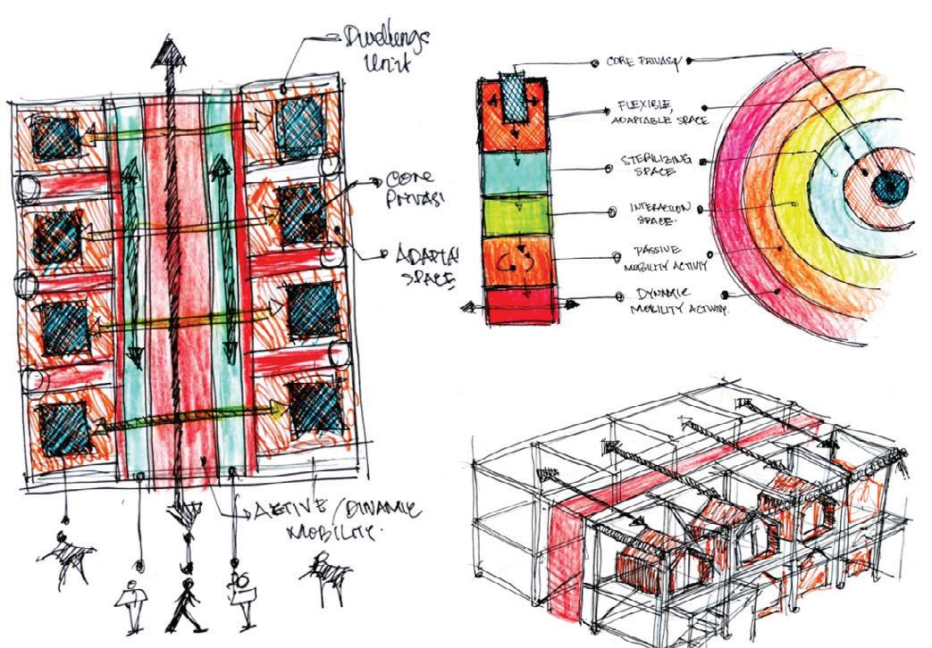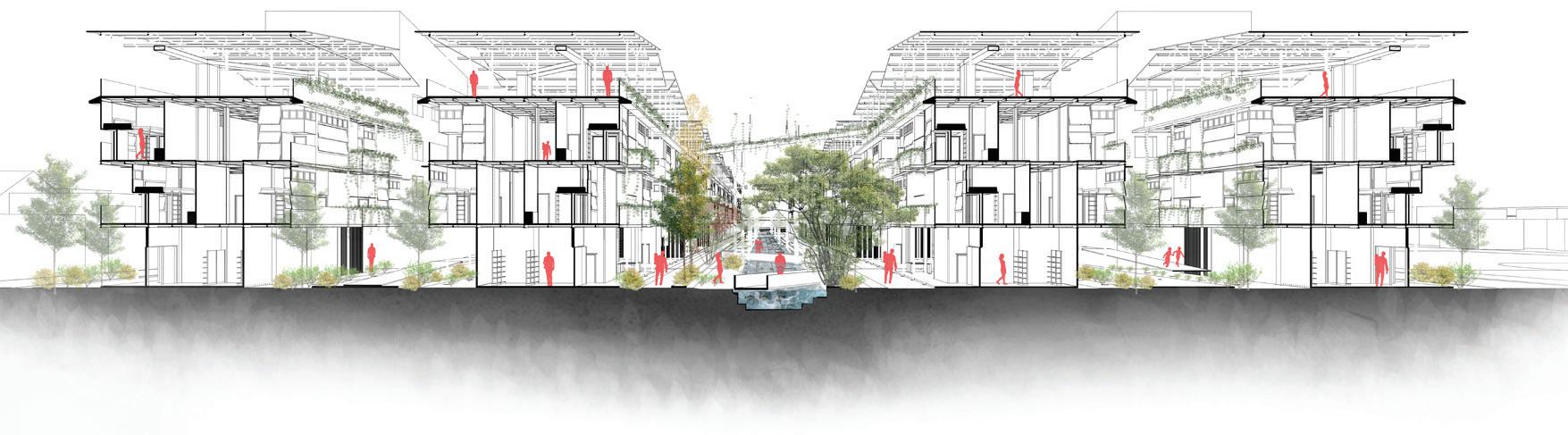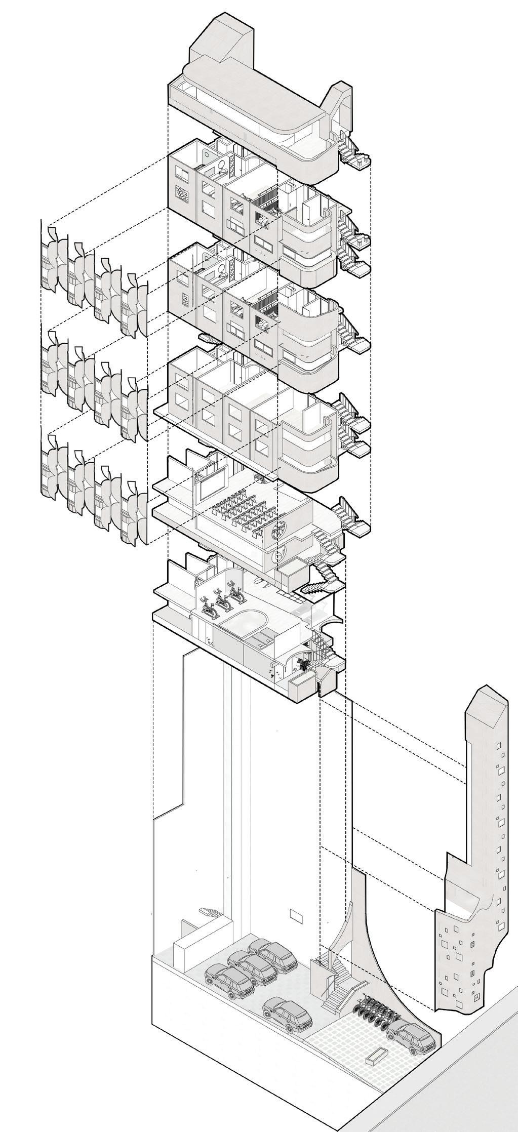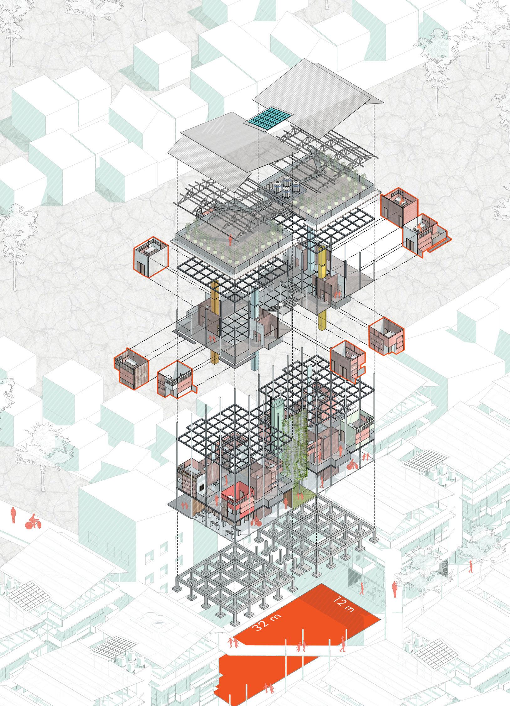 The dwellings units are not integrated with the building structure, but can be built after the mass block components exist. so that it is modular and can be disassembled. In addition, housing also carries the concept of growing housing.