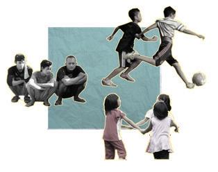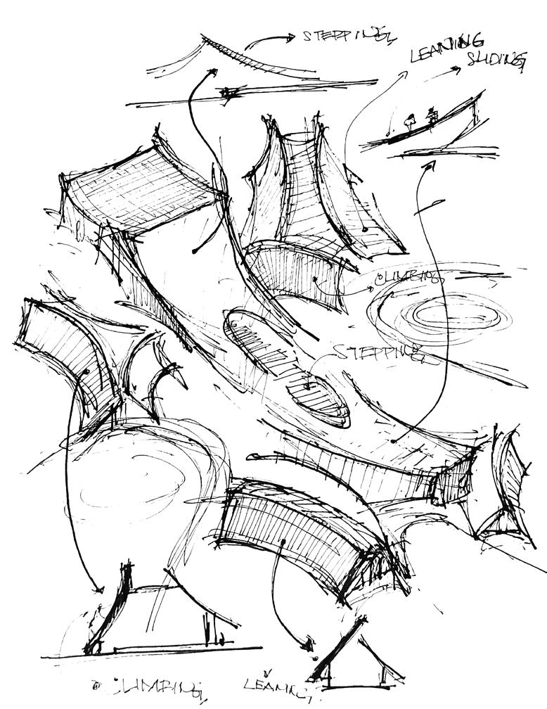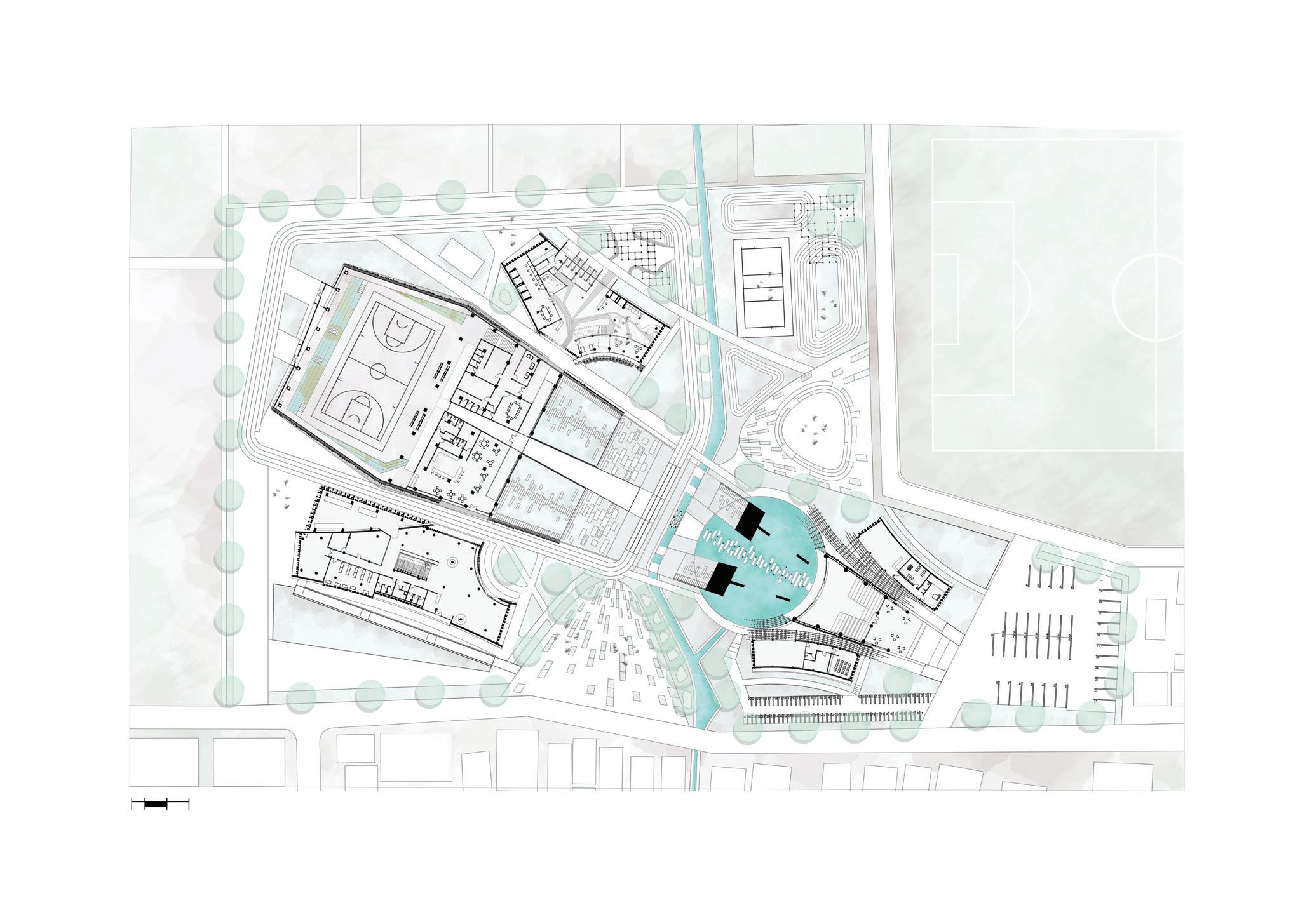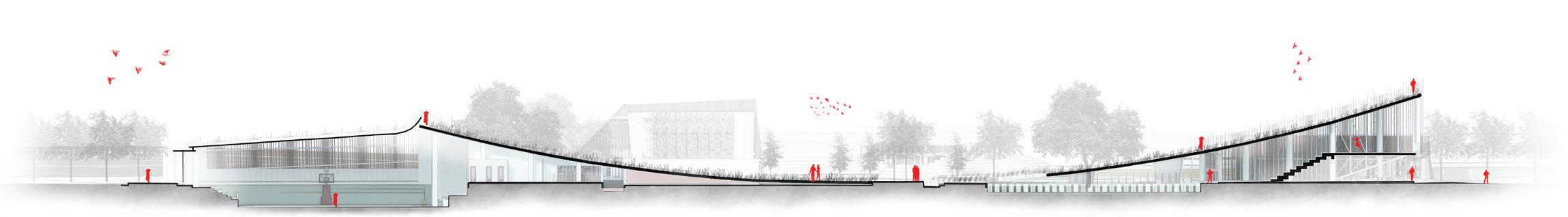 The playground structure promotes active movement, while the soil mound reuses excavation surplus. This mound acts as an amphitheater, offering views of the informal field, traditional arena, and the public football field outside the site.