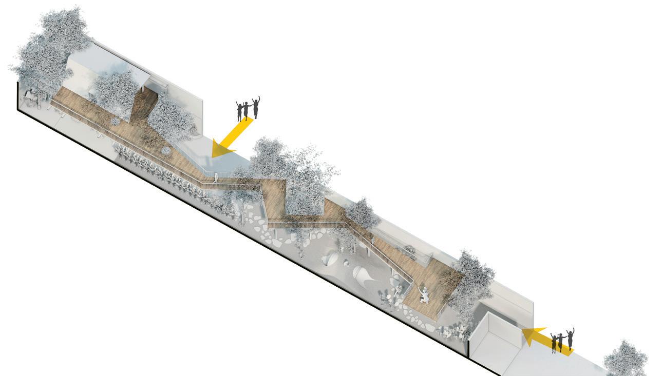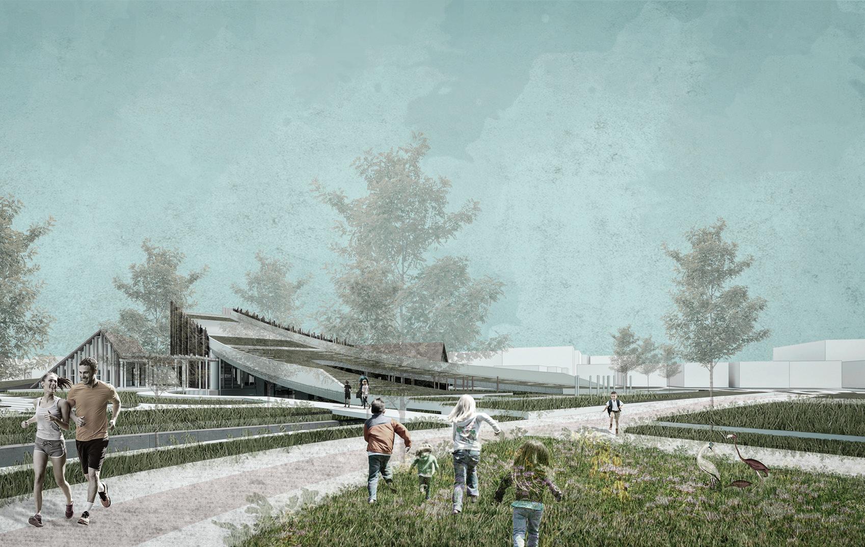 Roof vegetation is used to stimulate the sense of smell and encourage movement, with the choice of aromatic shrubs from native species that evoke strong scents, aiming to trigger childhood memories.