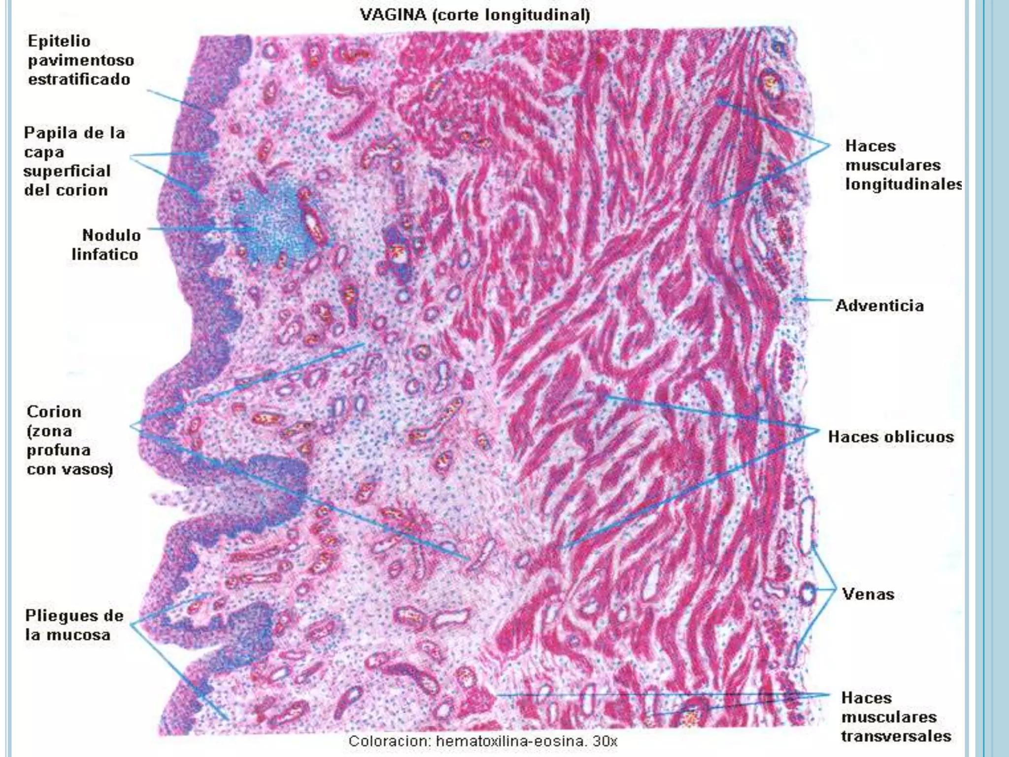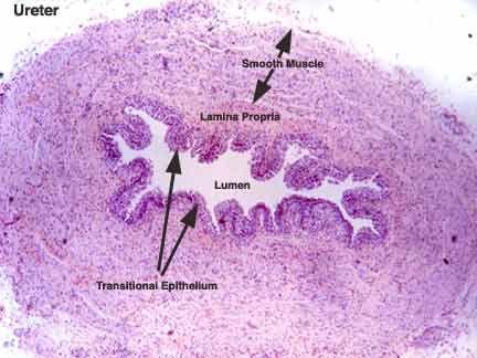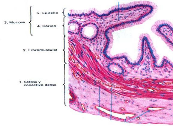 - Mucosa: revestida por epitelio de transición, las células presentan tres capas, una superficial que tiene células poliédricas grandes y multinucleadas, la capa intermedia que tiene células piriformes y en forma de cúpula y la capa celular basal que son células pequeñas con un solo núcleo en la membrana basal,